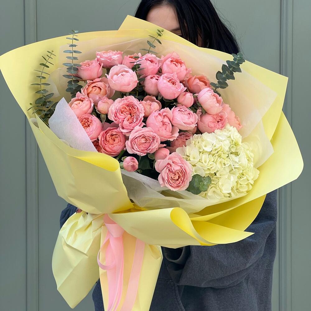 Гортензия и пионовидные розы Охара в большой коробке "Белоснежка"