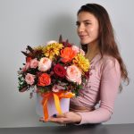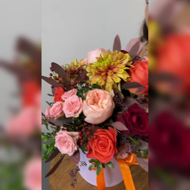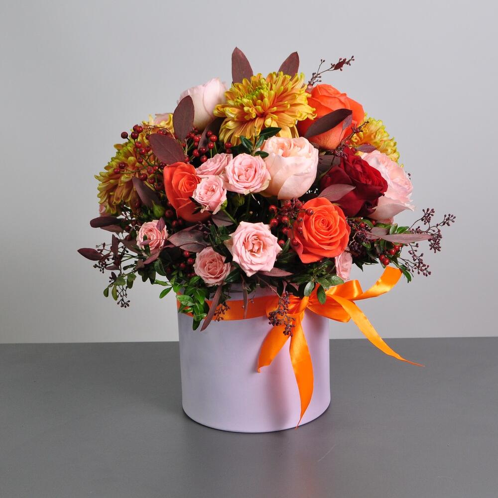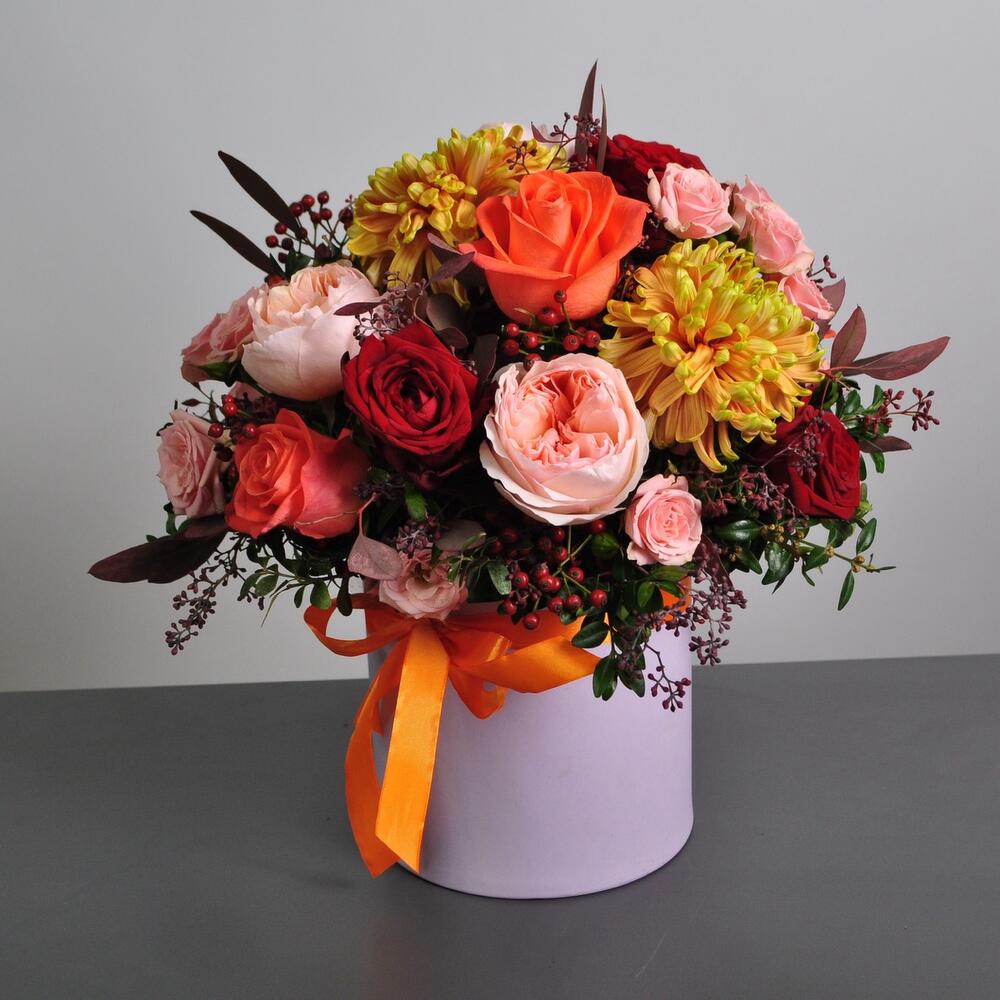 Сказочная осень в цветочной коробочке! Яркие оттенки роз и хризантем подарят вашему получателю тёплое и солнечное настроение!Яркий контрастный букет с пионовидными розами станет прекрасным подарком на день рождения, юбилей.Букет можно подарить на рождение ребёнка, … Показать ещёкрестины, годовщину свадьбы, день Учителя или другое праздничное событие)