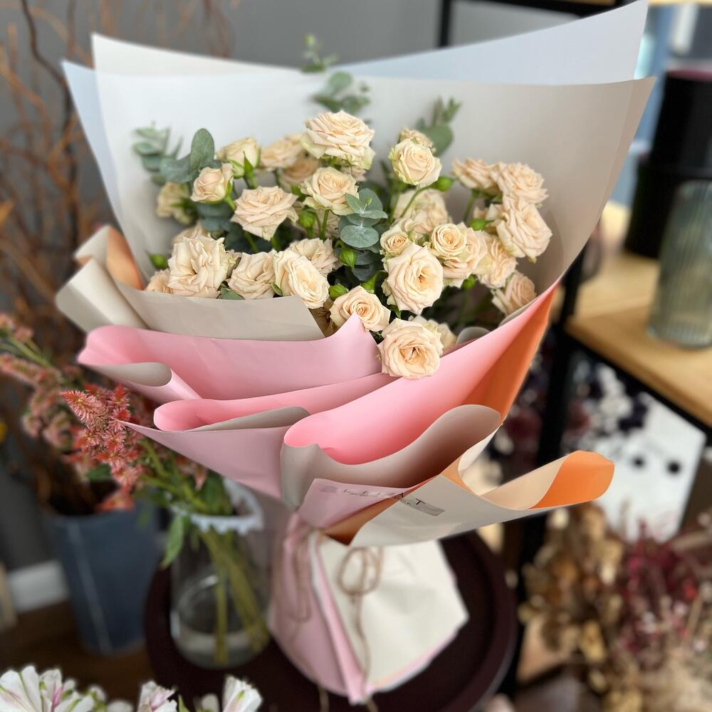 Альстромерии, Гвоздики, Кустовые розы, Лизиантусы, Розы, Хризантемы