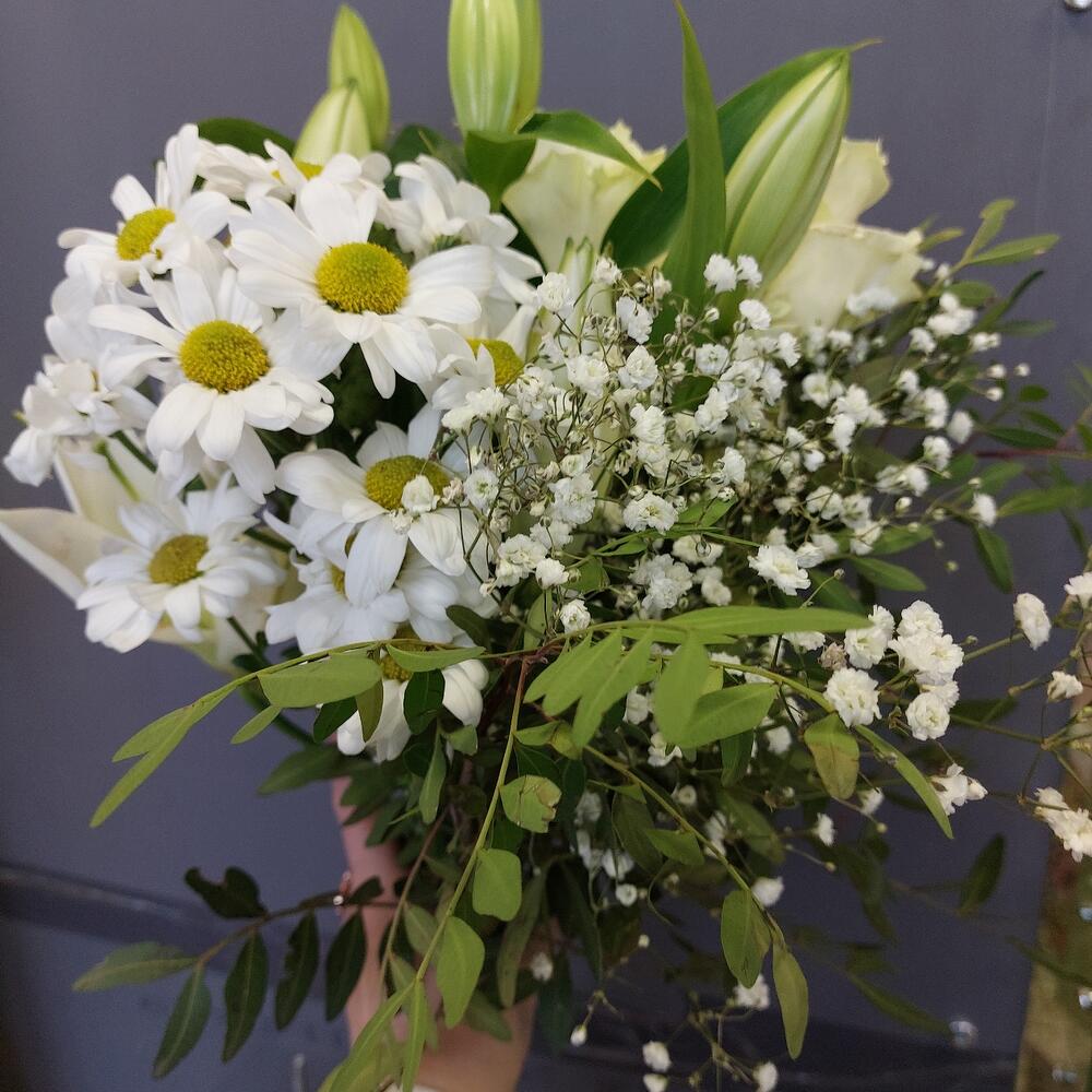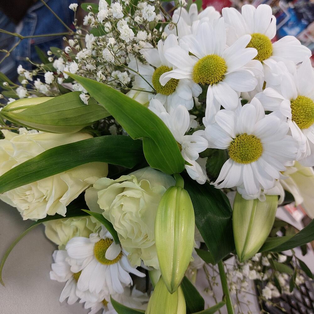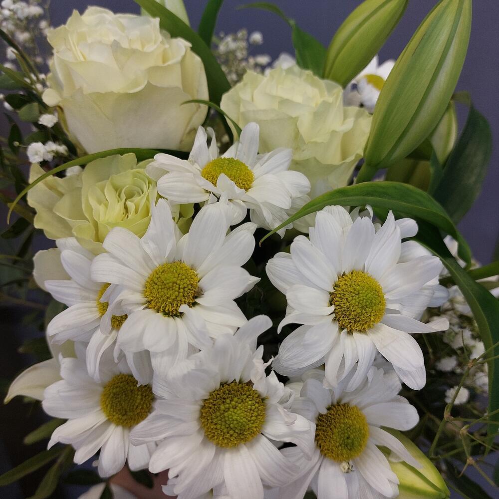 Лилия белая – 2 шт.Хризантема кустовая – 2 шт.Роза Мондиаль – 3 шт.Гипсофила – 1 шт.Фисташка – 3 шт.Лента атласная – 2 шт.