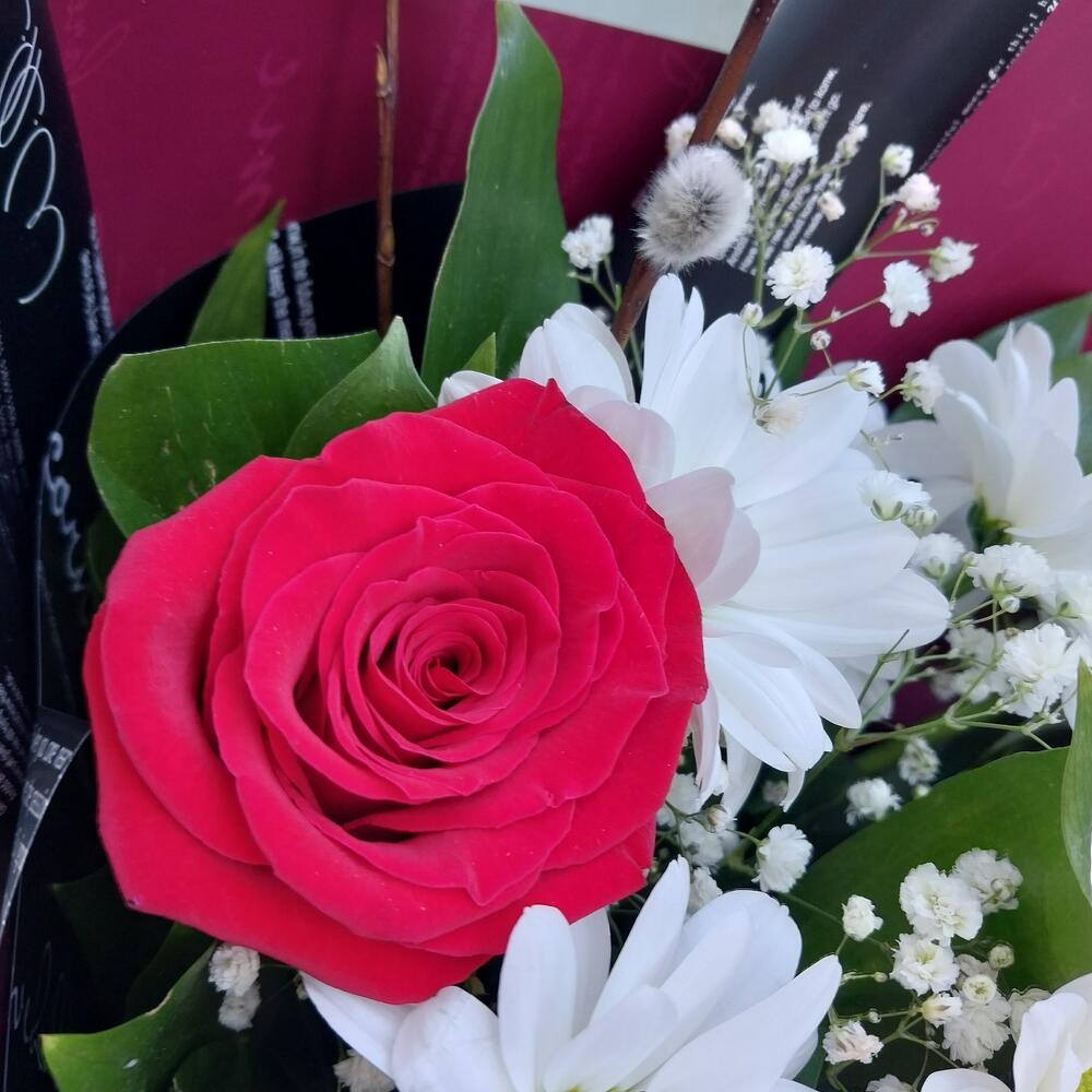 Роза Эквадор – 3 шт.Лента атласная – 1 шт.Упаковка дизайнерская – 4 шт.Рускус сочи – 10 шт.гипсофила белая – 1 шт.верба натуральная – 3 шт.бакарди ромашка хризантема кустовая – 1 шт.