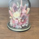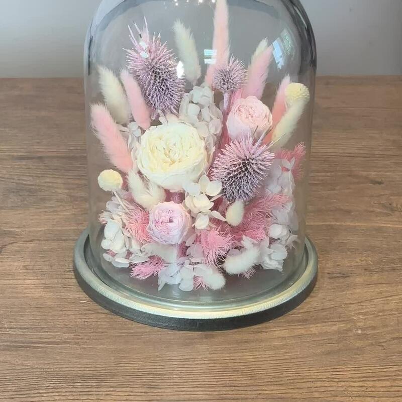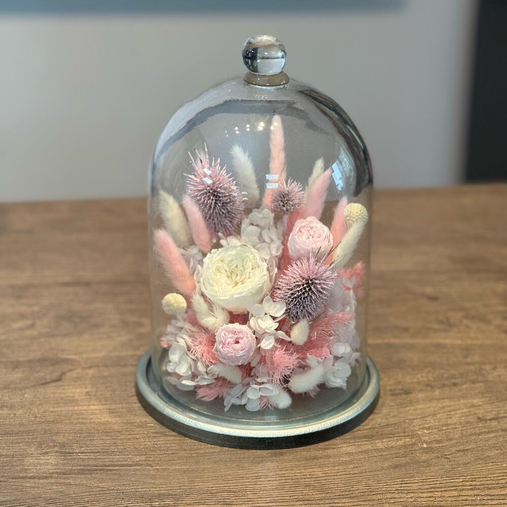 Клош из стекла – 1 шт.Роза стабилизированная – 3 шт.краспедия стабилизированная – 2 шт.гортензия стабилизированная – 2 шт.эрингиум сухоцвет – 3 шт.Лагурус (сухоцвет) – 20 шт.
