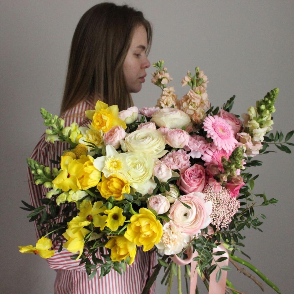 Клубнично-банановый, весенний букет с тюльпанами, нарциссами и ранункулюсами
