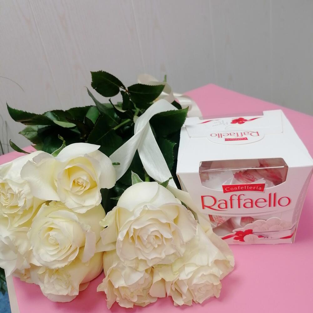 Роза Эквадор – 9 шт.Лента атласная – 1 шт.Конфеты Raffaello – 1 шт.