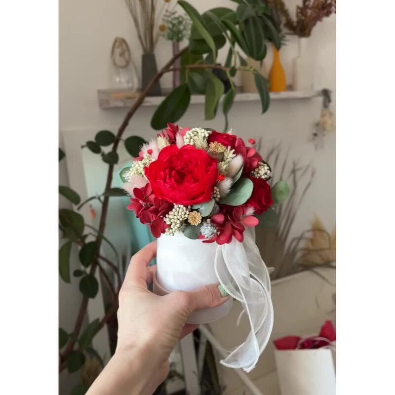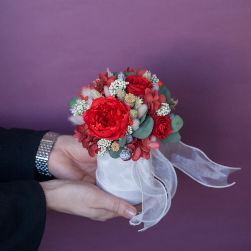 Композиция из сухоцветов и стабилизированных цветов в шляпной коробке (красная)