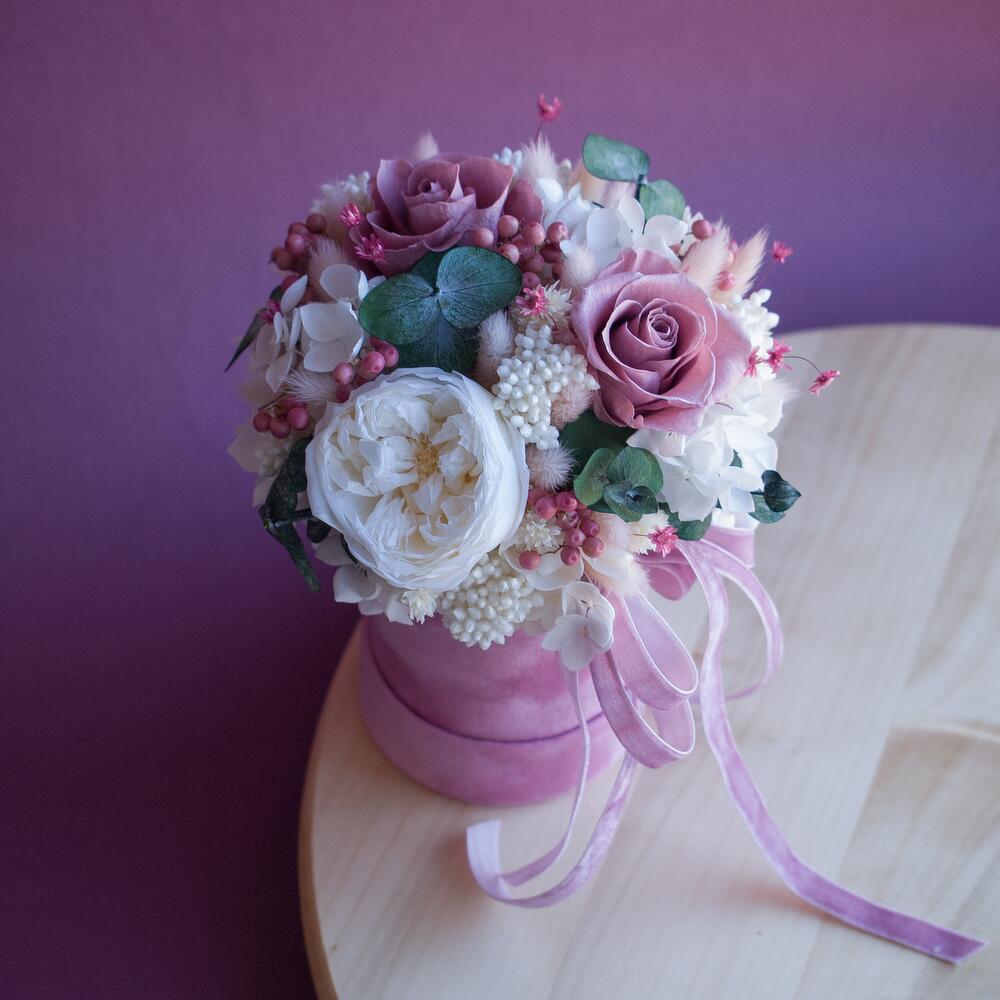 Композиция из сухоцветов и стабилизированных роз в мини шляпной коробке