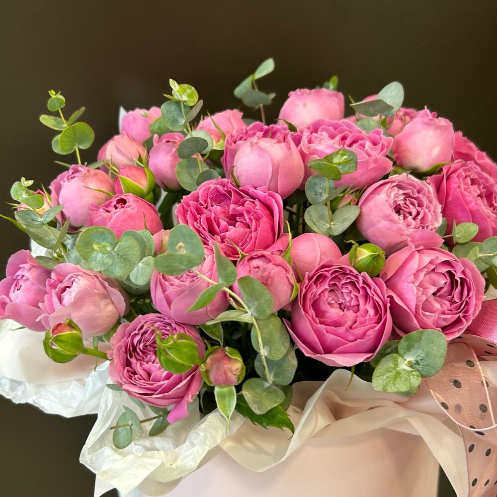 Коробка шляпная – 1 шт.Пиафлор (оазис) – 1 шт.Эвкалипт – 4 шт.Роза кустовая пионовидная – 10 шт.Лента атласная – 2 шт.Упаковка дизайнерская – 2 шт.