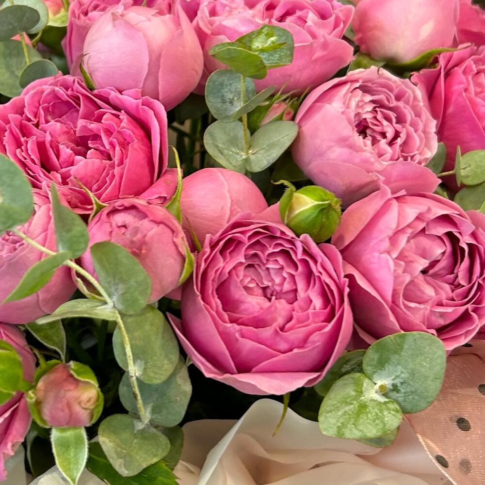 Композиция в коробке из Кустовых пионовидных роз и эустомы
