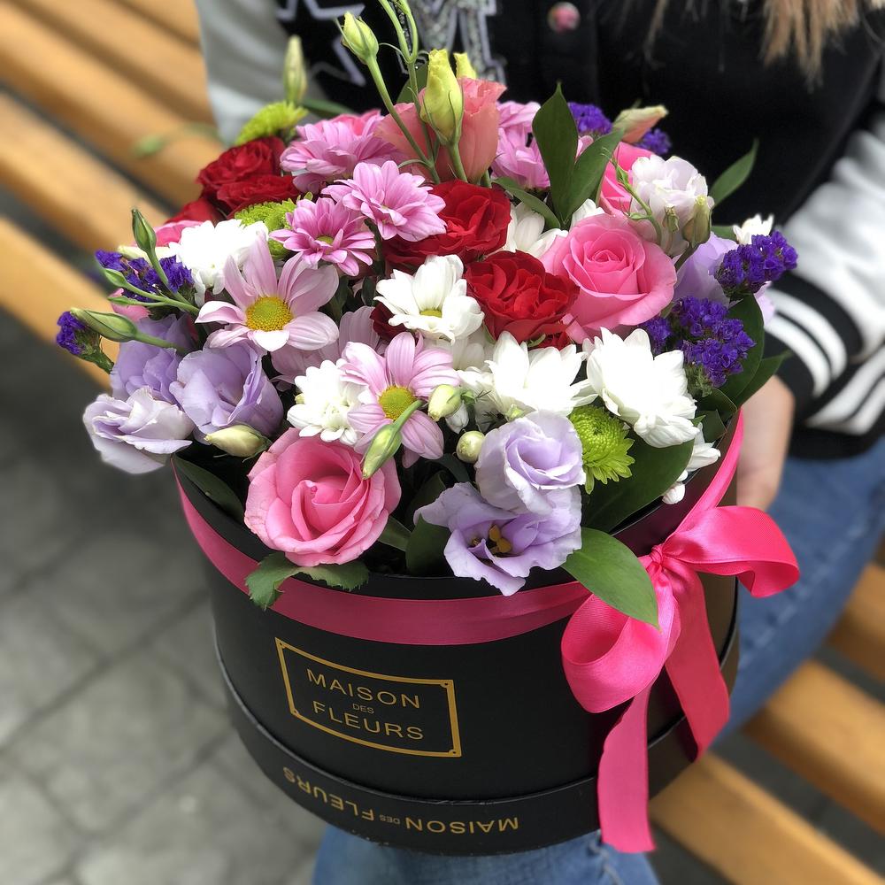 Роза розовая – 3 шт. Роза белая – 2 шт. Роза кустовая красная – 2 шт. эустома фиолетовая – 3 шт. Коробка подарочная с крышкой – 1 шт. Хризантема Кустовая Бакарди белая – 3 шт. Хризантема розовая бакарди – 2 шт. зелень декоративная – 5 шт.