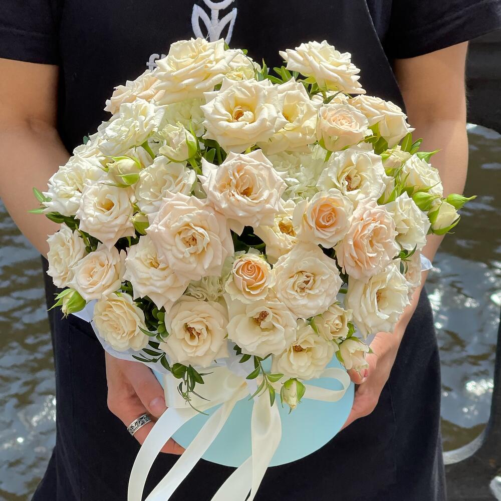 Роза кустовая – 9 шт.Коробка шляпная – 1 шт.Оазис флористический – 1 шт.Фисташка – 2 шт.Тишью – 2 шт.Лента атласная – 2 шт.Гвоздика одноголовая – 5 шт.