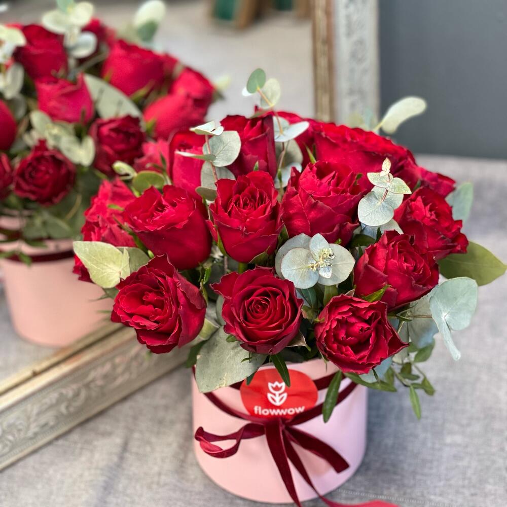 Роза одноголовая – 19 шт.Шляпная коробка – 1 шт.Оазис флористический – 1 шт.Эвкалипт – 1 шт.