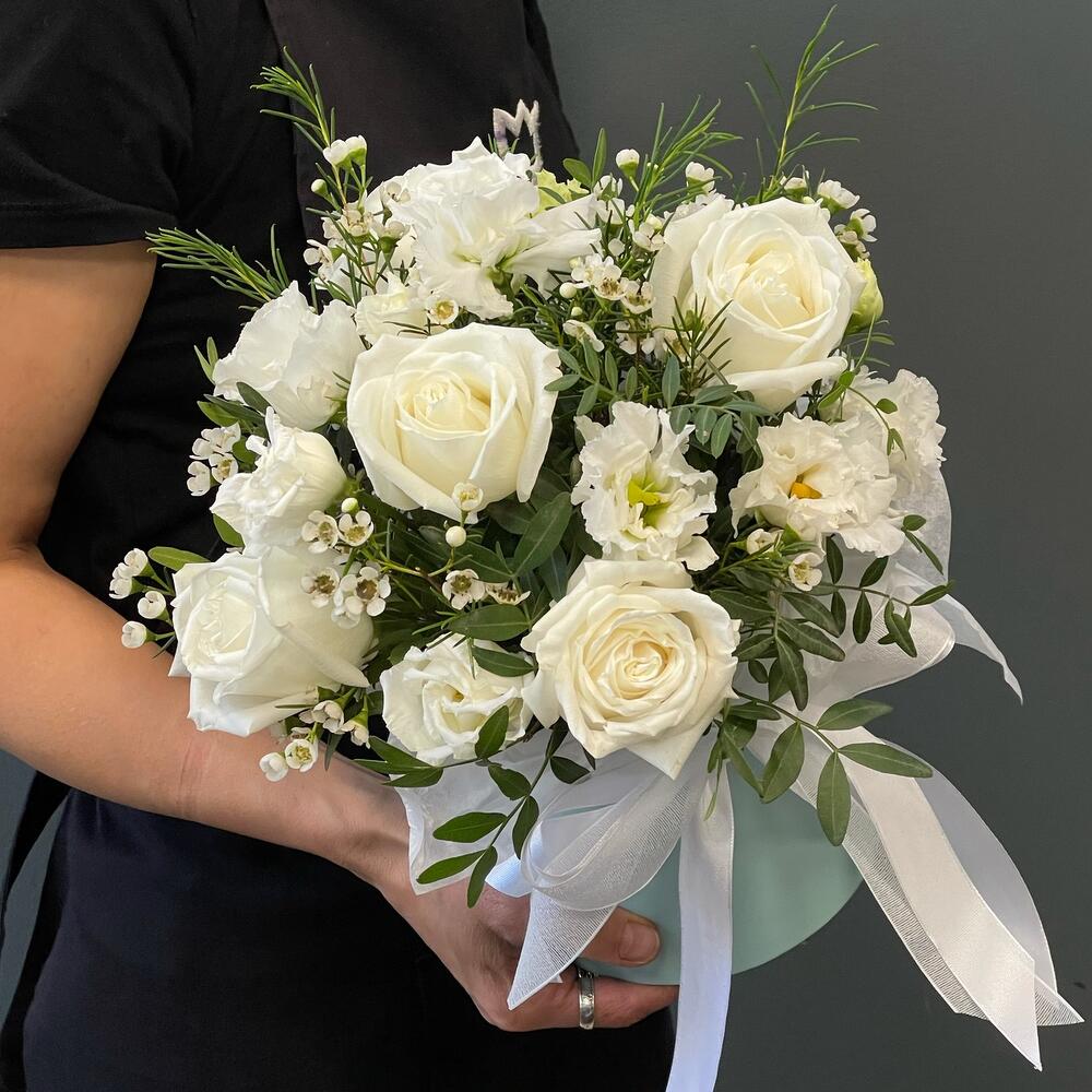 Композиция в шляпной коробке с белыми розами "Белоснежная"