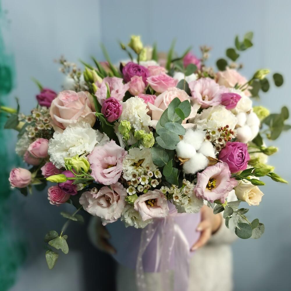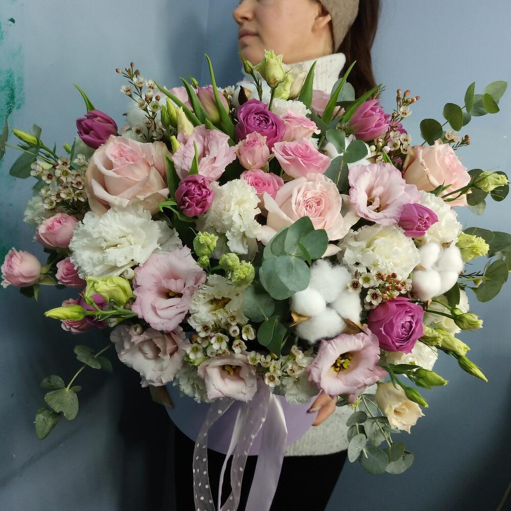 Коробка шляпная – 1 шт.Оазис флористический – 1 шт.Лента атласная – 2 шт.роза пинк охара(ароматная) – 5 шт.Тюльпан пионовидный – 7 шт.Эустома – 7 шт.Роза кустовая – 4 шт.Роза пионовидная кустовая – 4 шт.Хлопок натуральный – 6 шт.Хамелациум белый – 5 шт.Эвкалипт – 10 шт.
