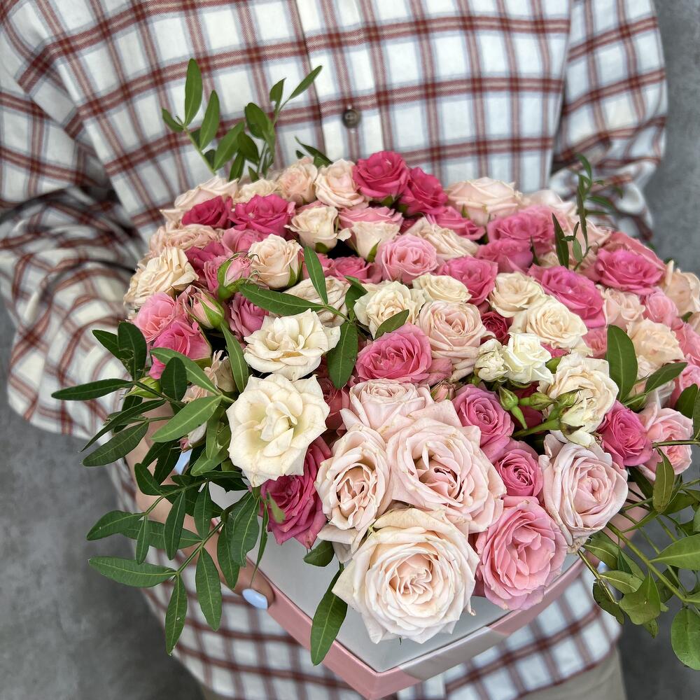 кустовая роза микс – 29 шт.Коробка в форме сердца – 1 шт.Оазис – 1 шт.зелень в ассортименте – 3 шт.