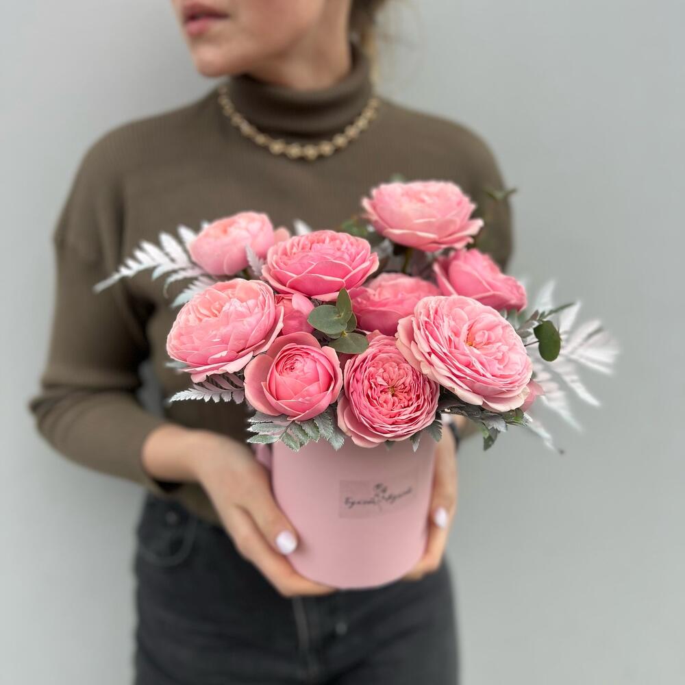 Эвкалипт – 1 шт.Коробка шляпная – 1 шт.Оазис флористический – 1 шт.Листья папоротника – 3 шт.роза кения пионовидная кустовая – 3 шт.