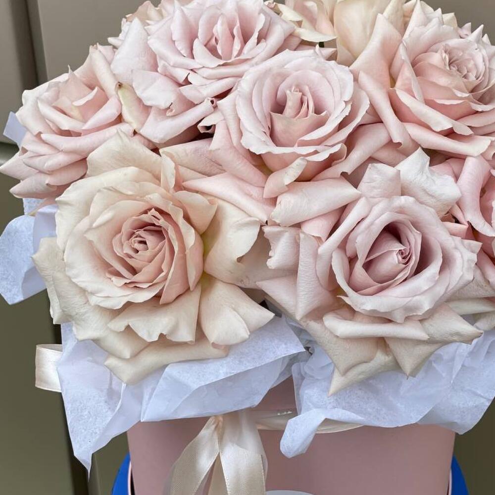 Роза Эквадор – 11 шт.Лента атласная – 1 шт.Тишью – 4 шт.Шляпная коробка – 1 шт.Оазис флористический – 2 шт.лента силиконовая брендированная – 1 шт.