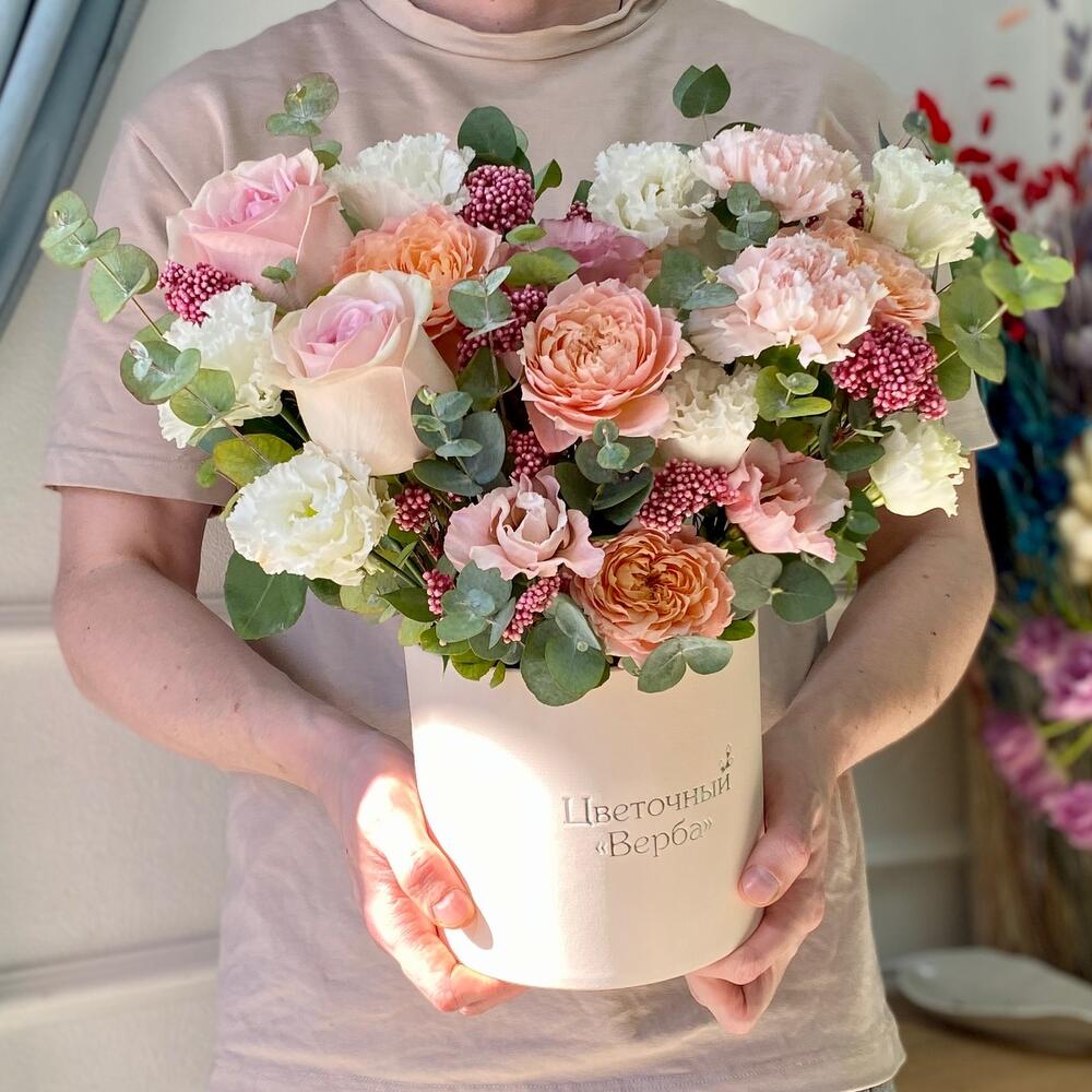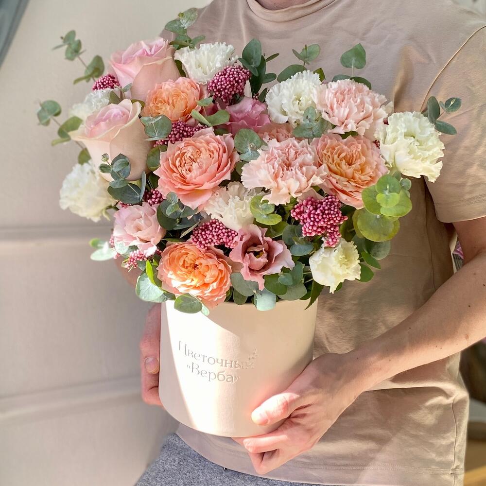 Кустовая роза – 2 шт.Гвоздика – 3 шт.Коробка шляпная – 1 шт.Роза розовая – 2 шт.эустома розовая – 1 шт.эустома белая – 2 шт.озотамнус стабилизированный – 9 шт.эвкалипт композиционный – 30 шт.