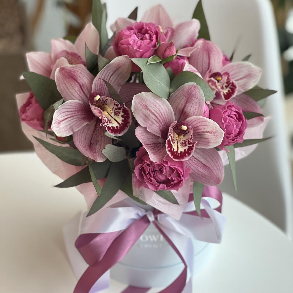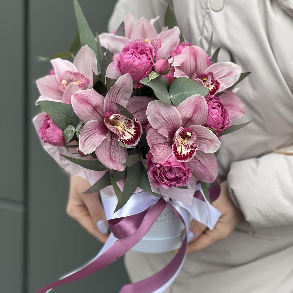 цимбидиум (орхидея) – 7 шт. кустовая пионовидная роза misty bubbles – 3 шт. Эвкалипт – 2 шт. Коробка – 1 шт. Оазис – 1 шт.