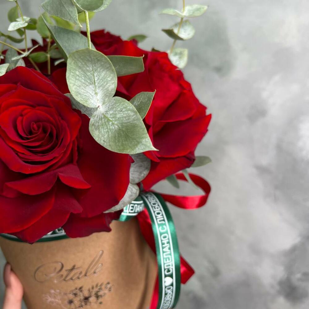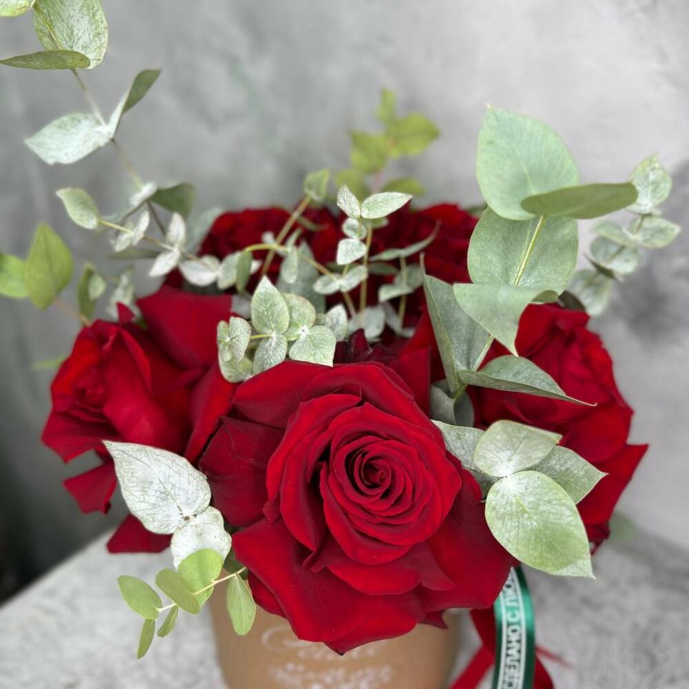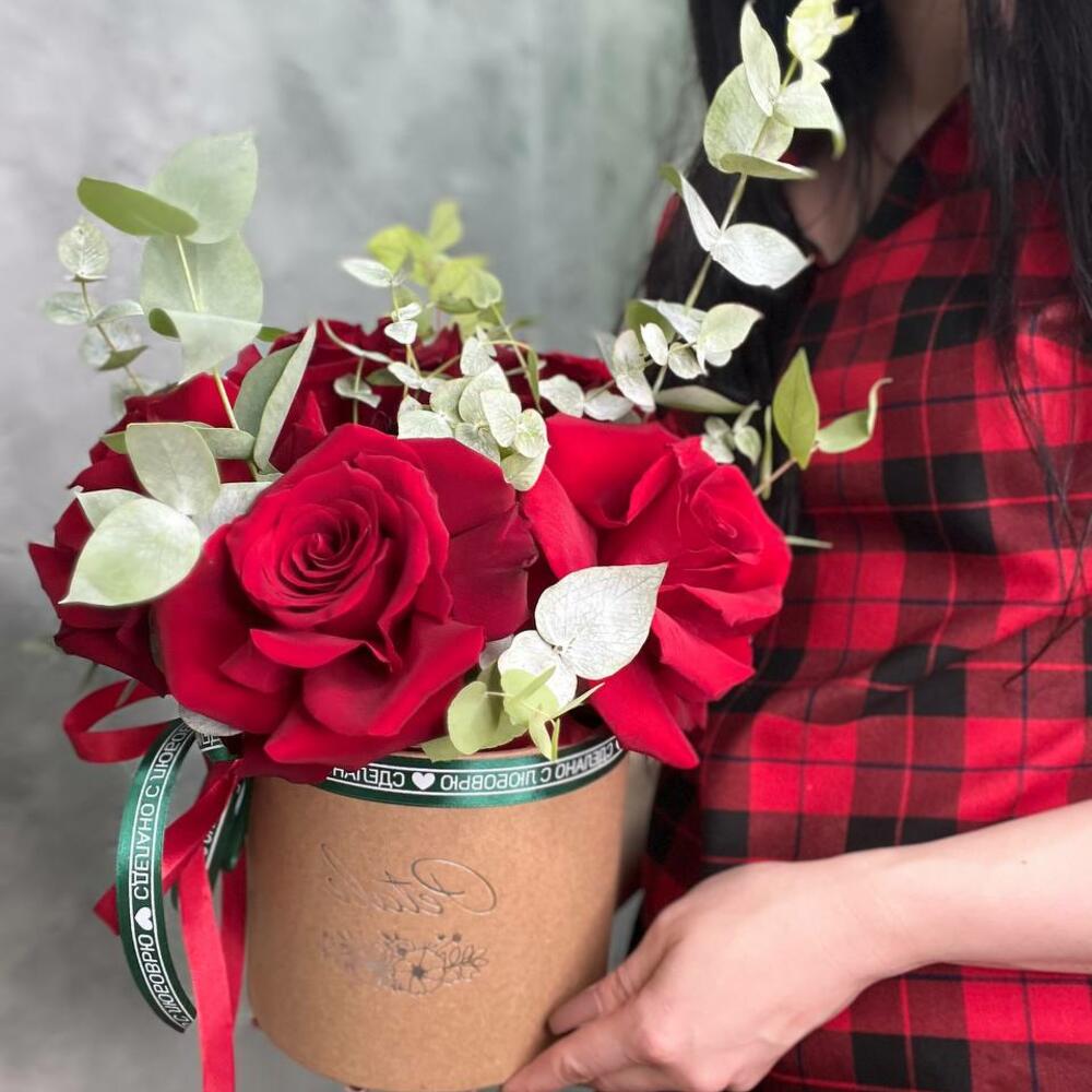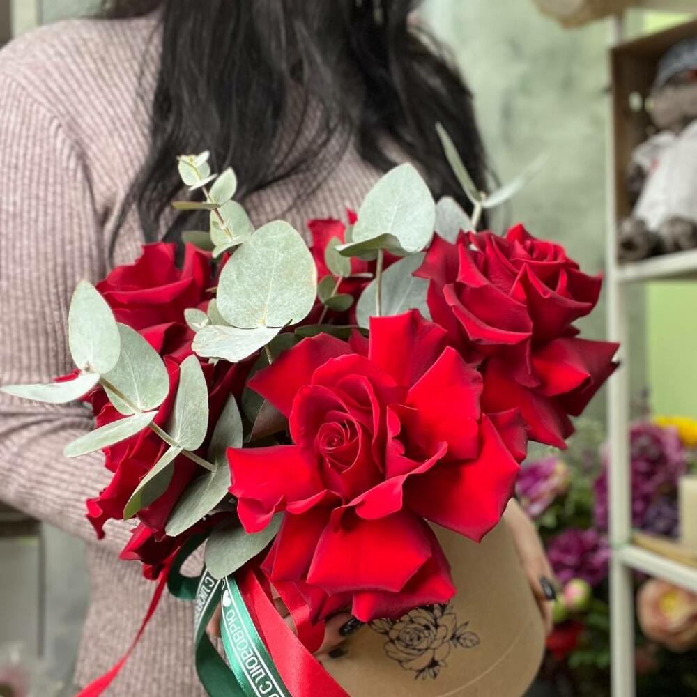 Эвкалипт – 3 шт.Лента атласная – 2 шт.Шляпная коробка – 1 шт.Пена флористическая – 1 шт.Французская роза – 5 шт.