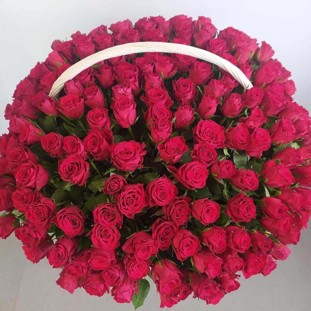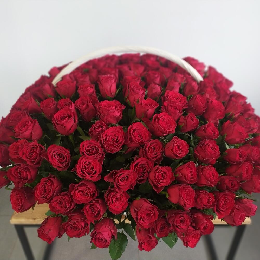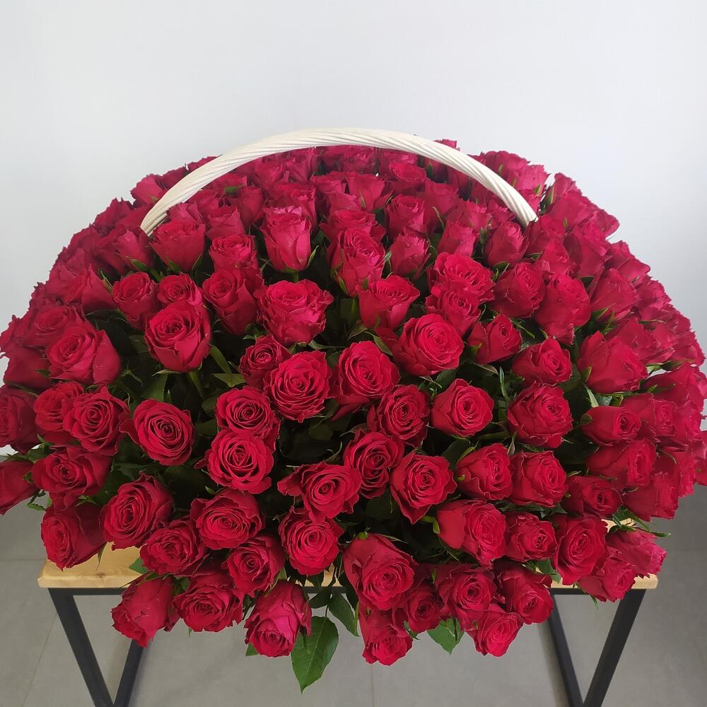 Роза красная – 201 шт.Корзина плетеная большая – 1 шт.Оазис флористический – 7 шт.