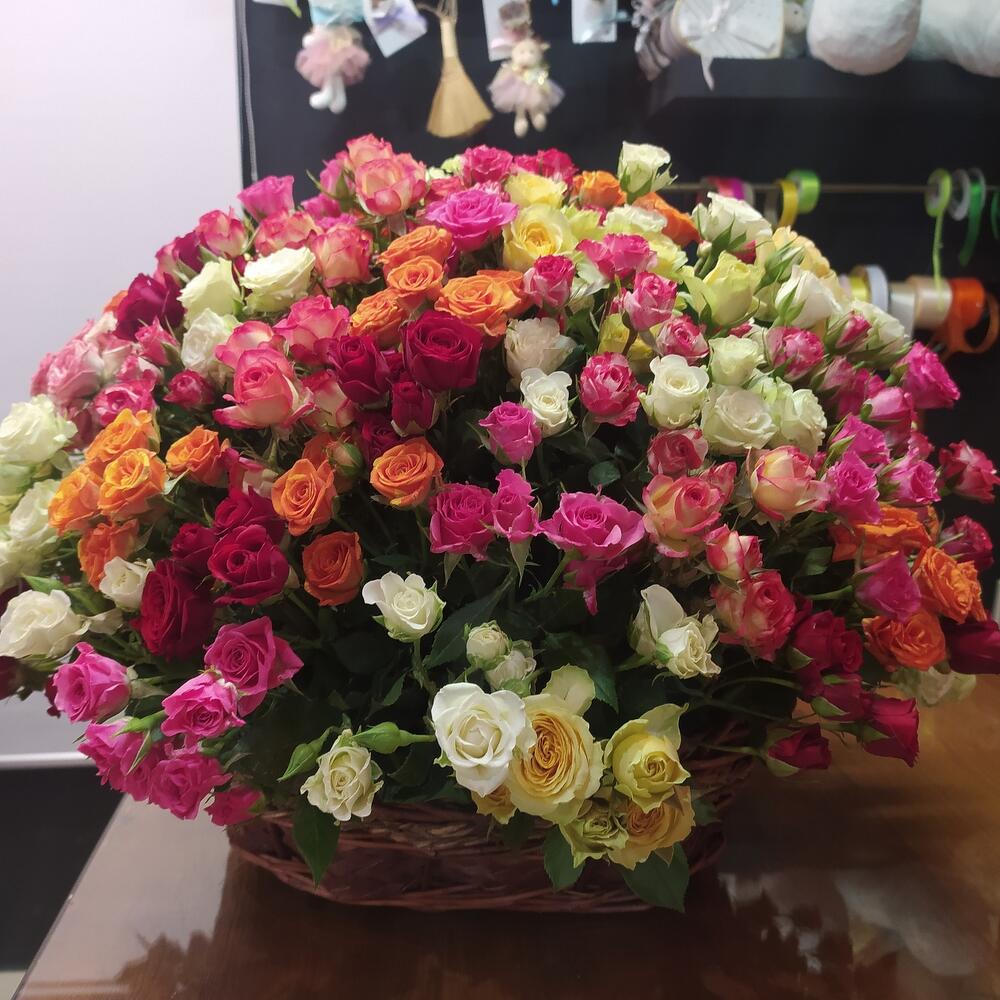 роза кустовая микс – 81 шт.Корзина плетеная – 1 шт.Оазис флористический – 3 шт.