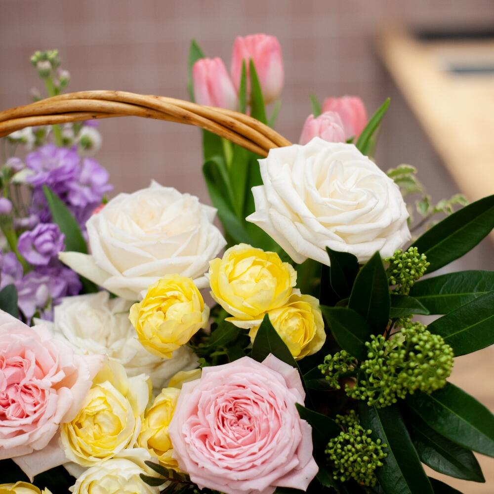 Пионовидная роза – 6 шт.Пионовидная кустовая роза – 3 шт.Диантус – 5 шт.Скиммия – 5 шт.Тюльпан – 6 шт.Маттиола – 4 шт.Хризантема кустовая – 3 шт.Зелень – 6 шт.Корзина плетеная – 1 шт.