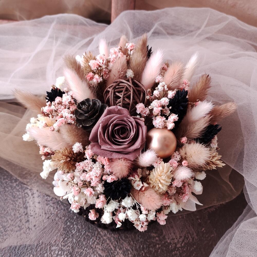Гипсофила – 5 шт.Лимониум – 1 шт.Роза стабилизированная – 1 шт.Лагурус – 20 шт.фаларис сухоцвет – 15 шт.корзина вязаная ручной работы – 1 шт.