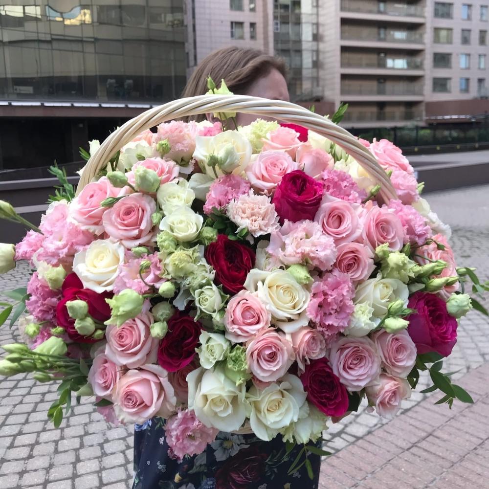 роза девида остина – 7 шт.Эустома – 9 шт.Роза белая – 15 шт.Гвоздика сортовая – 5 шт.Эвкалипт – 10 шт.самшит зелень – 10 шт.Корзина – 1 шт.Оазис флористический – 2 шт.Роза кустовая розовая – 10 шт.