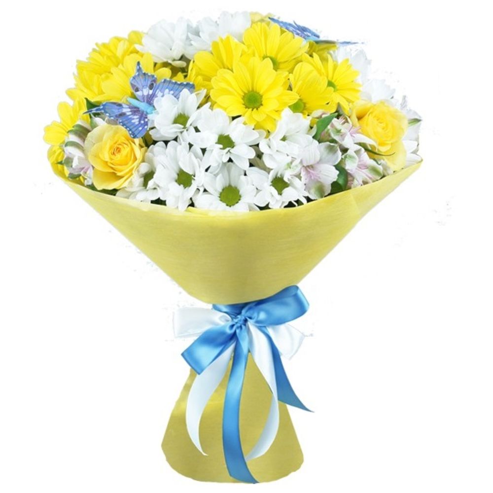 Роза желтая – 7 шт.Лента декоритивная – 1 шт.Бабочка – 3 шт.Альстромерия белая – 5 шт.Фетр – 1 шт.Хризантема кустовая белая – 6 шт.Хризантема кустовая желтая – 4 шт.