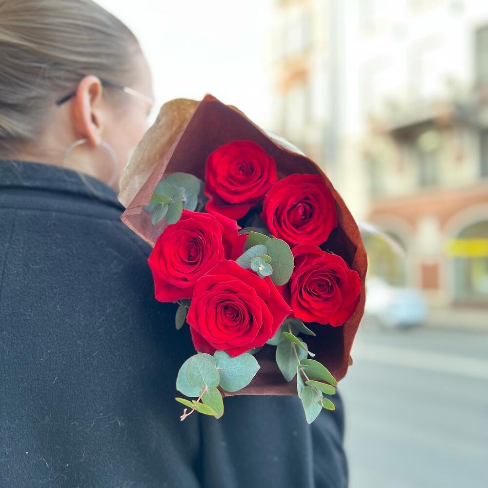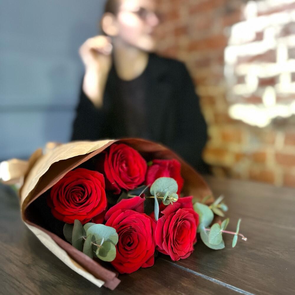 Лента – 1 шт.Эвкалипт – 1 шт.Тишью – 1 шт.Крафт – 1 шт.Красная роза – 5 шт.