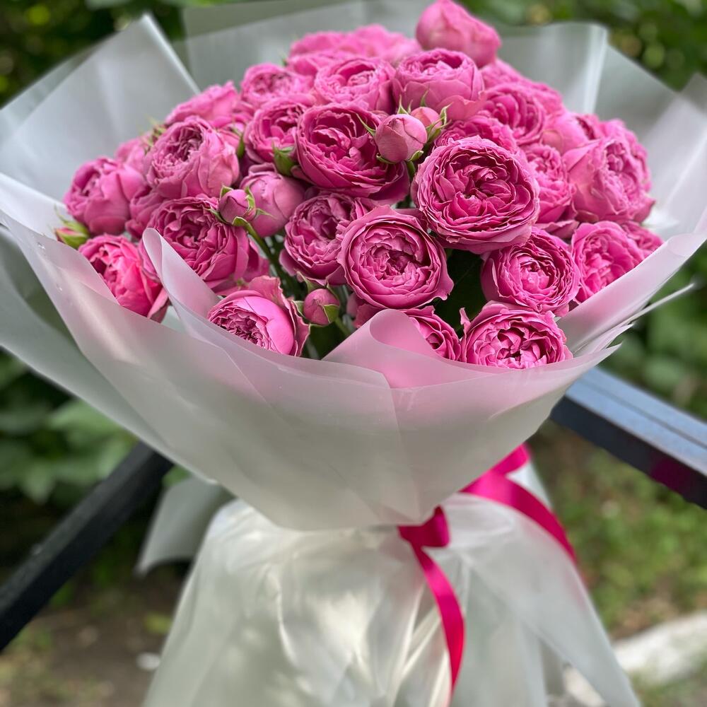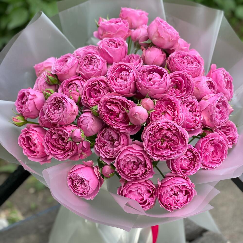 Роза кустовая пионовидная – 13 шт.Оформление матовая пленка – 7 шт.Лента – 1 шт.