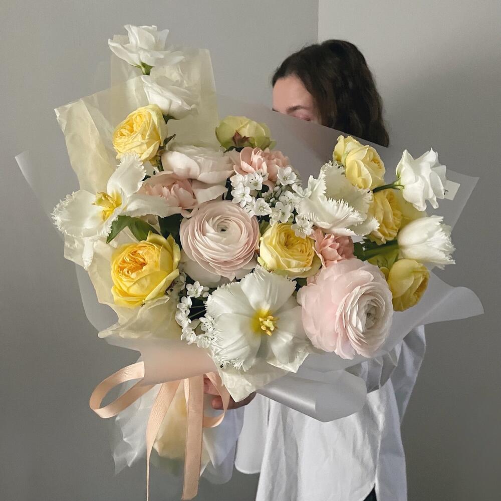Лизиантус – 2 шт.Тюльпан – 4 шт.Диантус – 3 шт.Ранункулюс – 3 шт.Роза кустовая пионовидная – 3 шт.Аллиум – 3 шт.