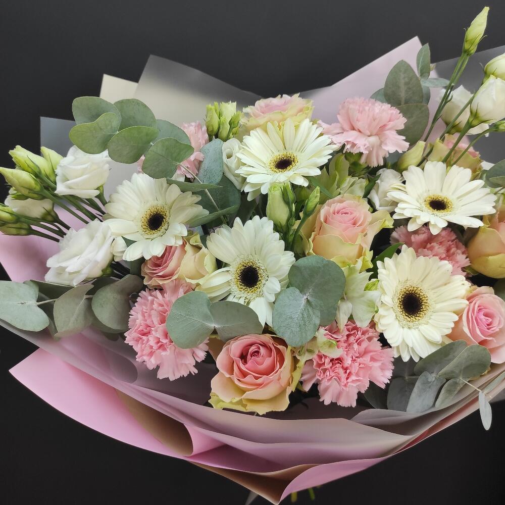 Гербера – 5 шт.Роза – 7 шт.Лизиантус – 3 шт.Диантус – 5 шт.Эвкалипт – 2 шт.Упаковка дизайнерская – 1 шт.