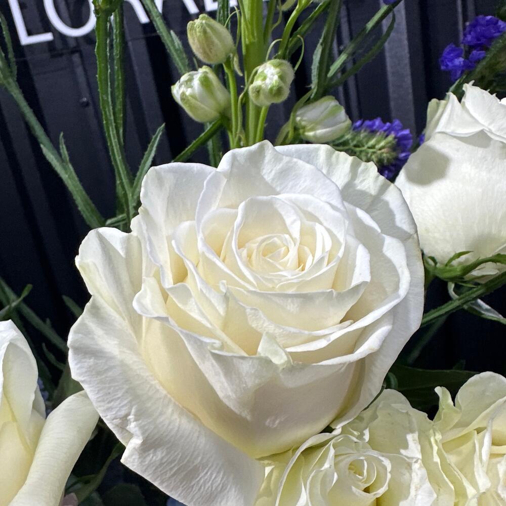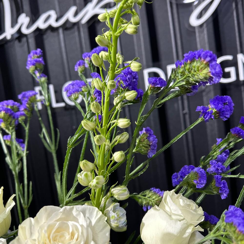 Букет, составленный из статицы, роз и дельфиниума, представляет собой мягкое и воздушное произведение искусства. Статица добавляет нотки изысканной грациозности и стойкости, розы приносят тепло и нежность, а дельфиниум создает атмосферу загадочности и нежных оттенков голубого неба. Этот букет словно путешествие через эмоциональные грани, в котором каждый цветок вносит свой уникальный вклад в гармонию и красоту композиции.