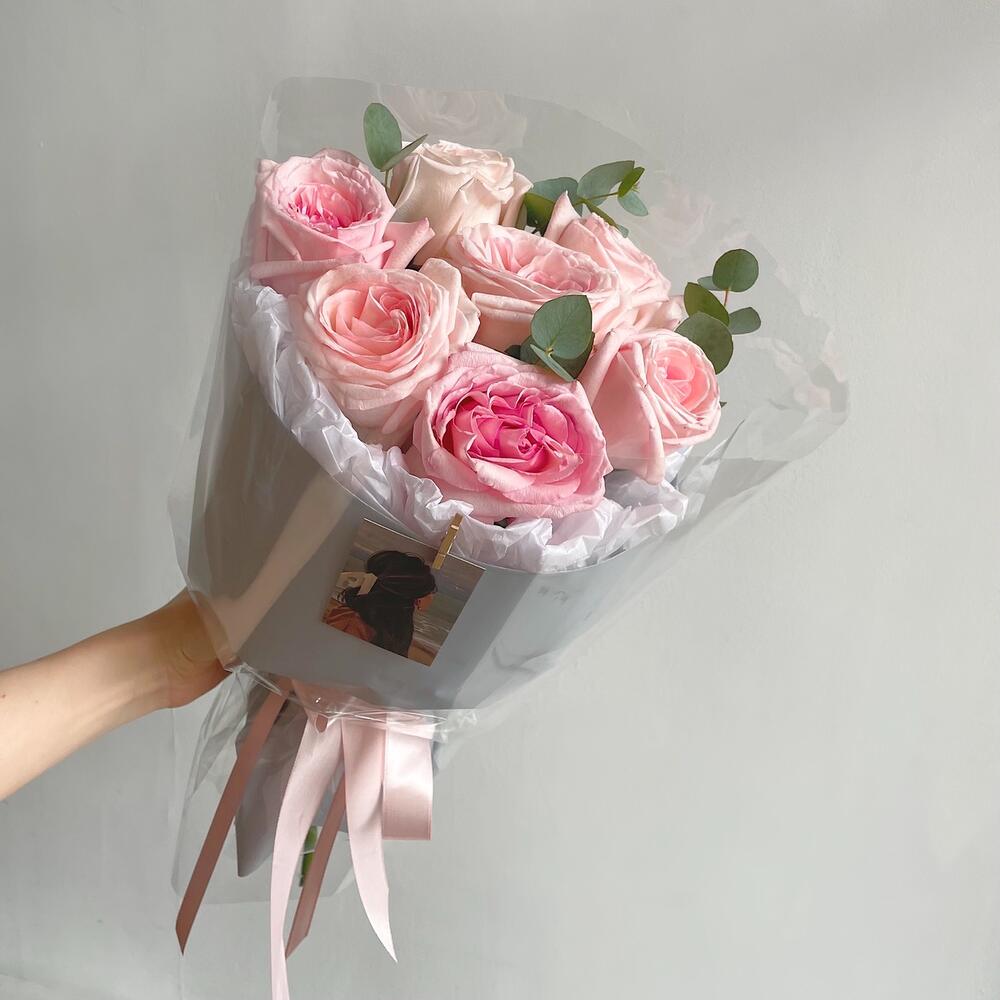 Эвкалипт – 3 шт.Упаковка дизайнерская – 1 шт.роза пинк охара(ароматная) – 7 шт.
