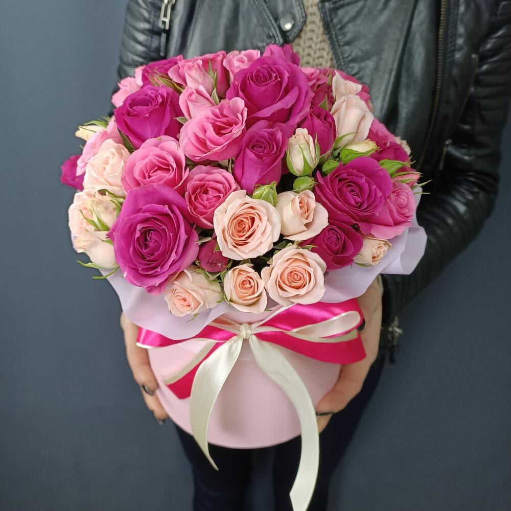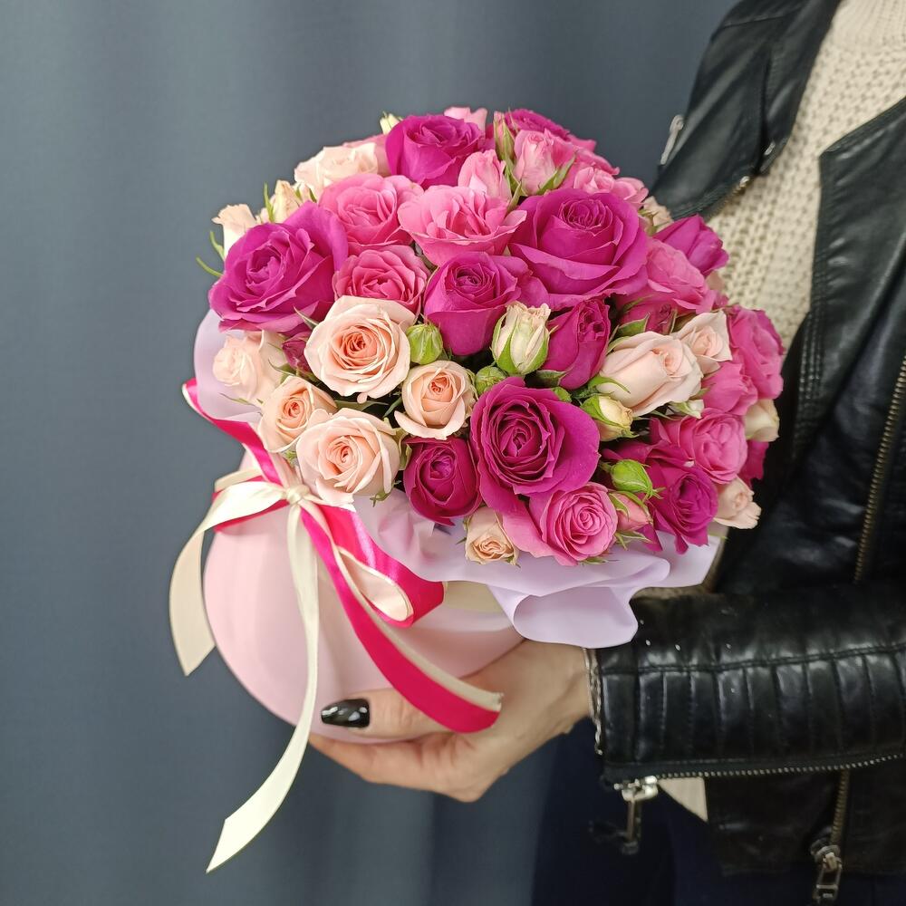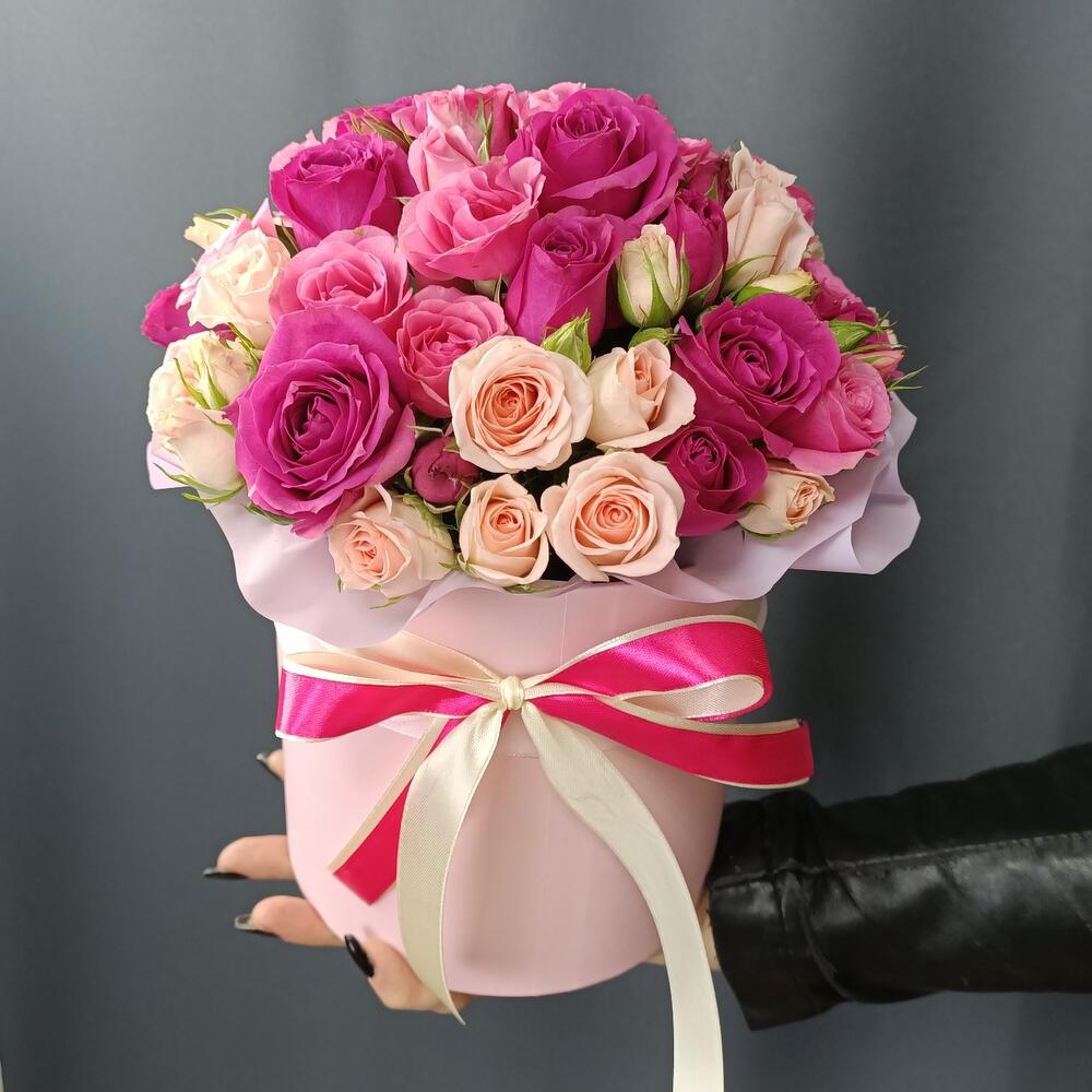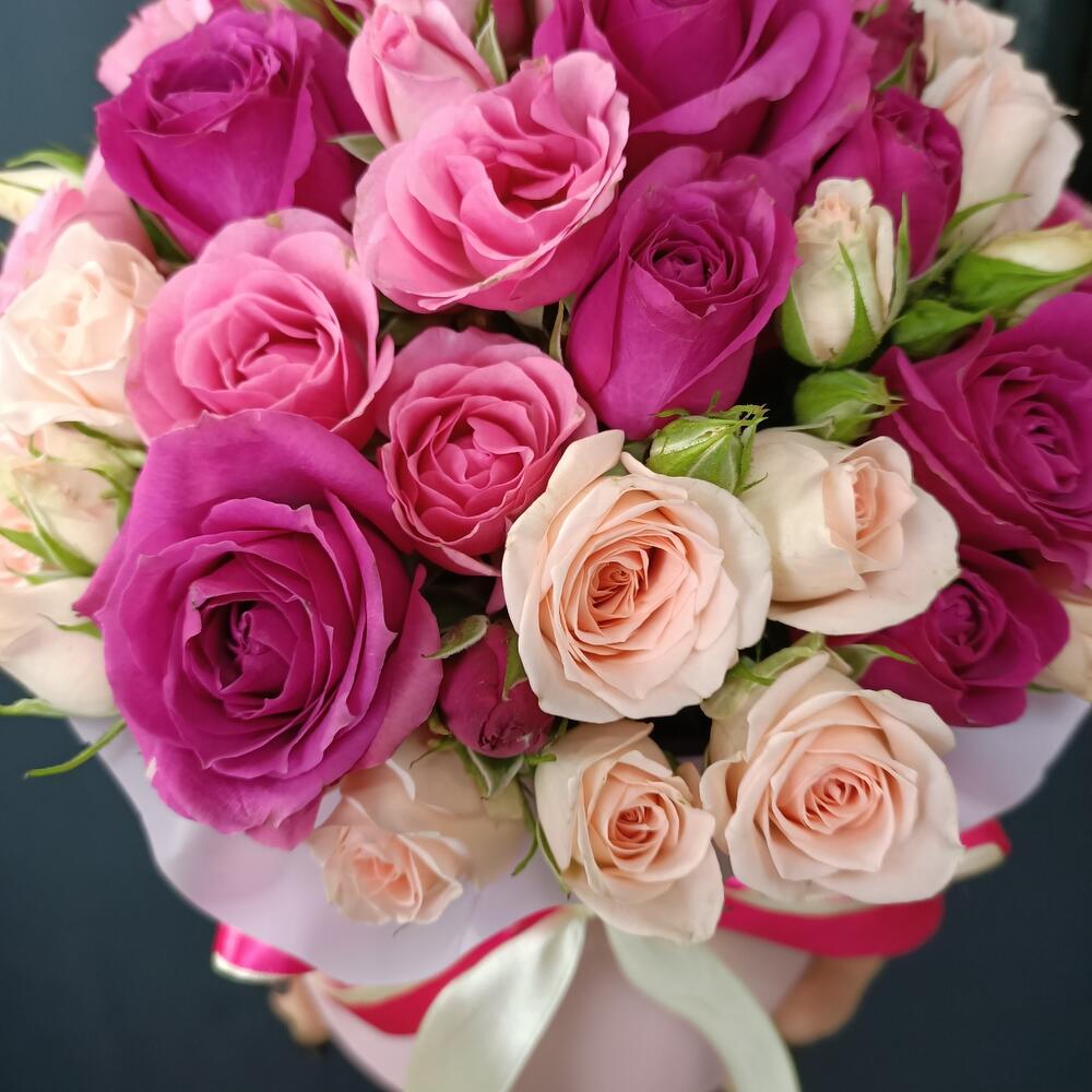 Роза кустовая – 15 шт.Шляпная коробка с лентами – 1 шт.