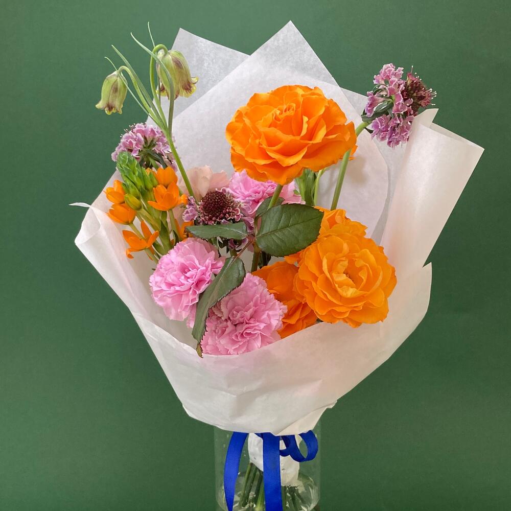 Скабиоза – 3 шт.Роза – 4 шт.Гвоздика – 8 шт.Орнитогалум – 2 шт.Фритиллярия – 1 шт.