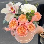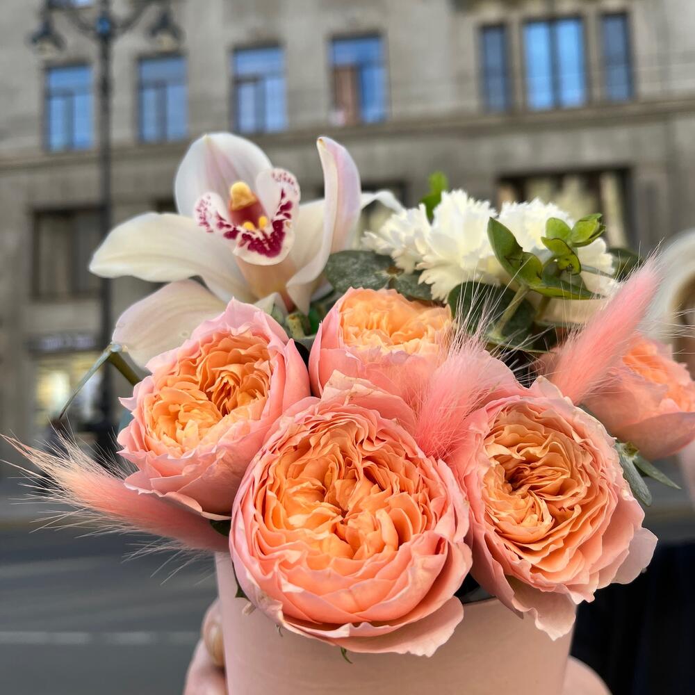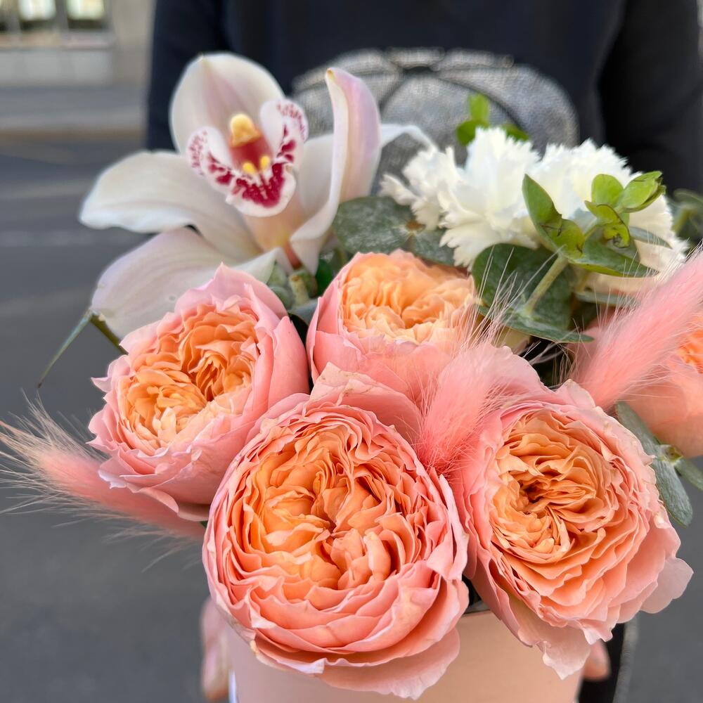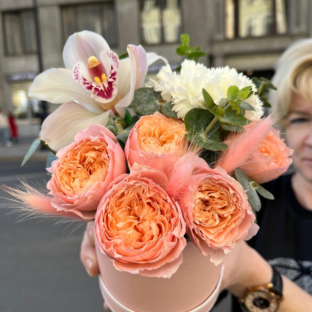 Эвкалипт – 1 шт.Диантус белый – 1 шт.Оазис флористический – 1 шт.удлинитель для орхидеи – 1 шт.Шляпная коробка мини – 1 шт.Роза кустовая пионовидная джульетта – 1 шт.лагурус нежно-розовый – 3 шт.орхидея цимбидиум премиум белая – 1 шт.