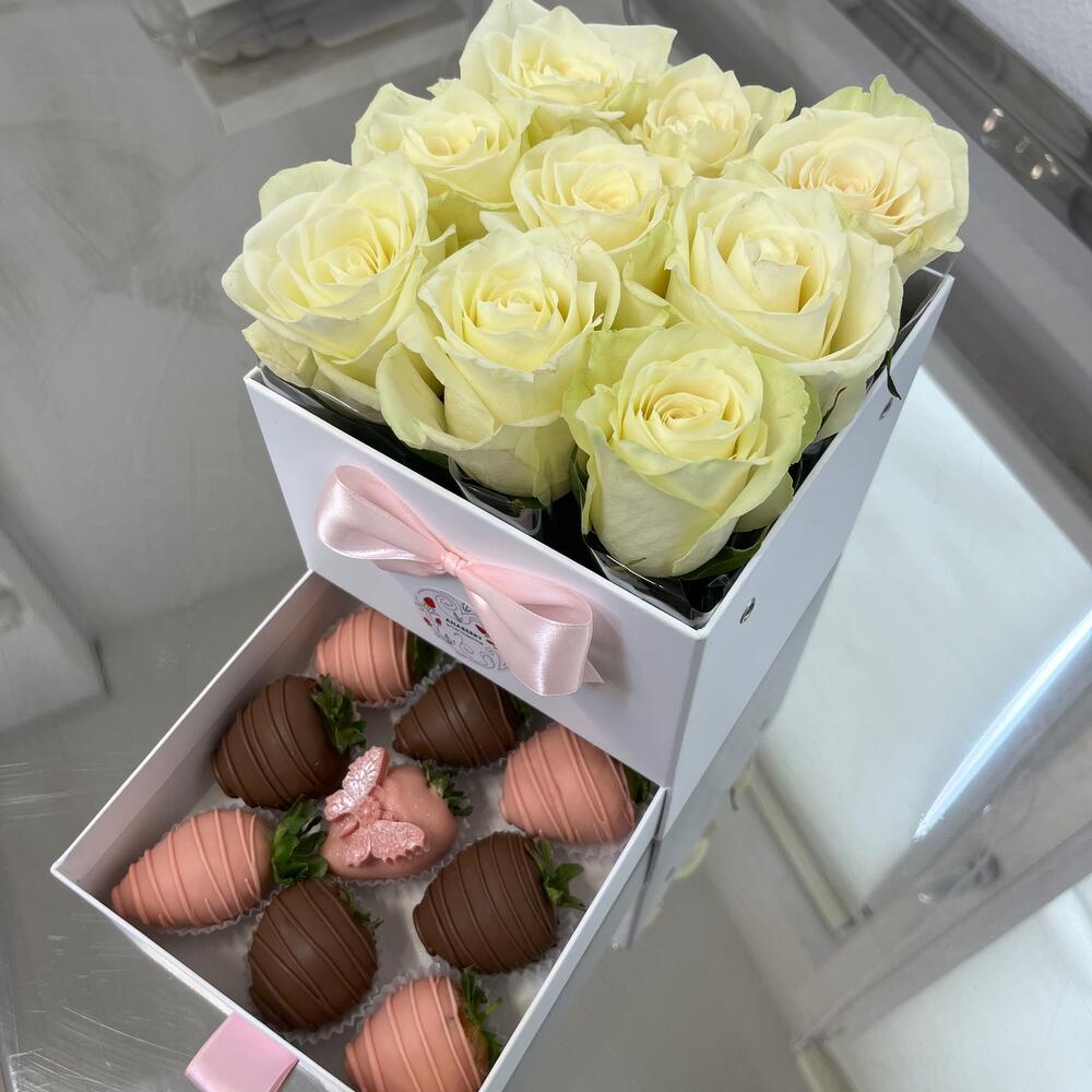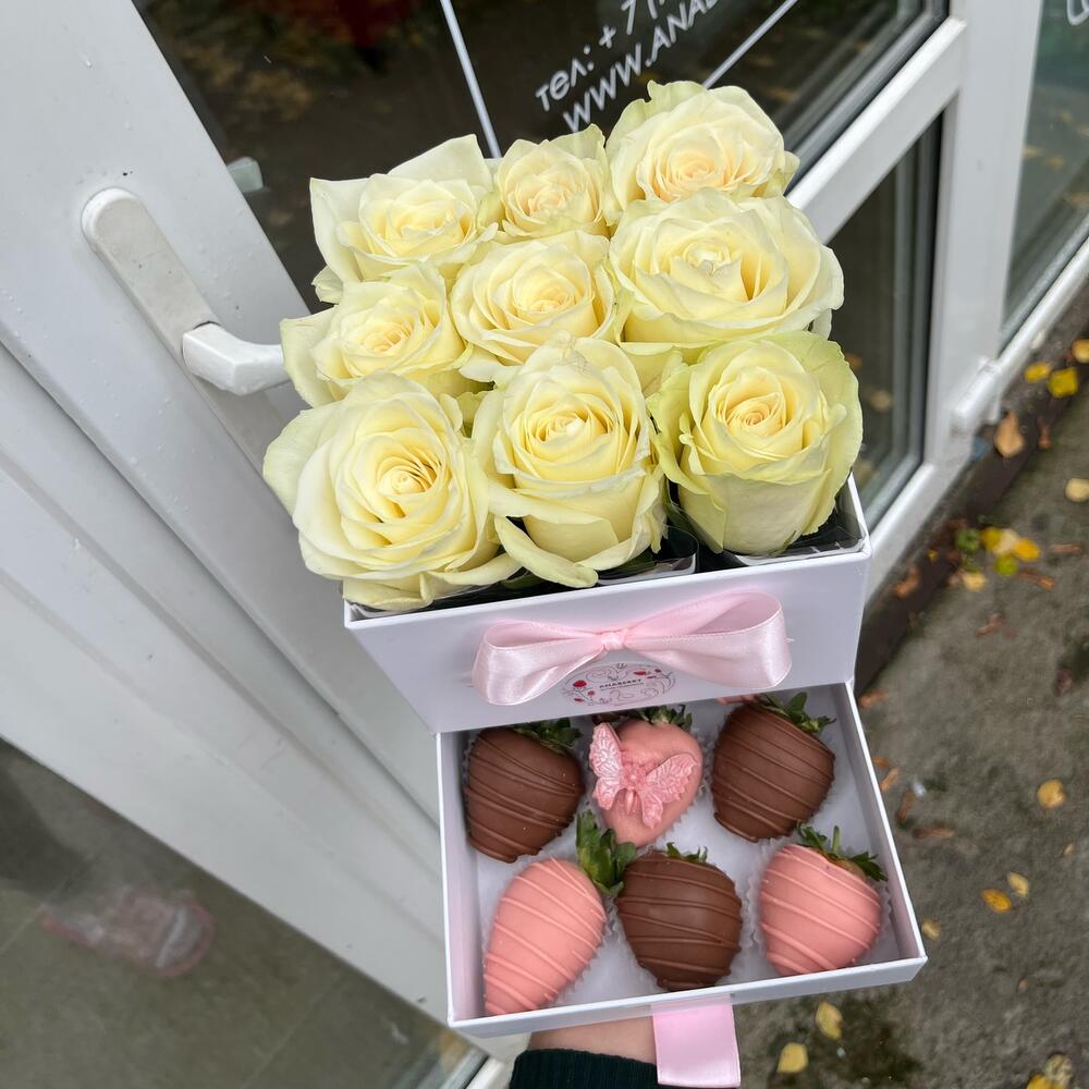 Роза – 9 шт.Клубника в шоколаде callebaut (бельгия) – 9 шт.Коробка шляпная – 1 шт.