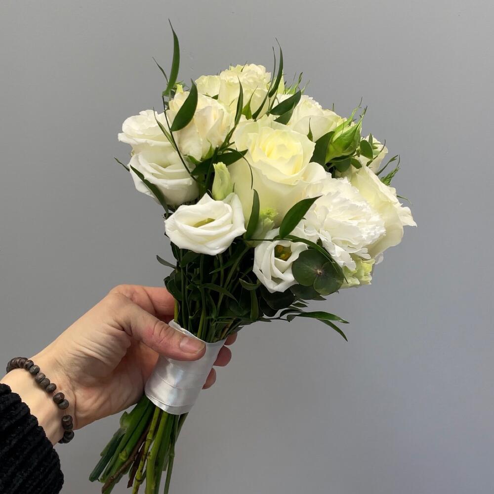 Лизиантус – 2 шт.Роза кустовая – 2 шт.Рускус – 1 шт.Эвкалипт – 1 шт.Роза одноголовая – 3 шт.Гвоздика сортовая – 3 шт.Лента атласная – 1 шт.Фисташка – 1 шт.Бутоньерка – 1 шт.Булавка – 1 шт.