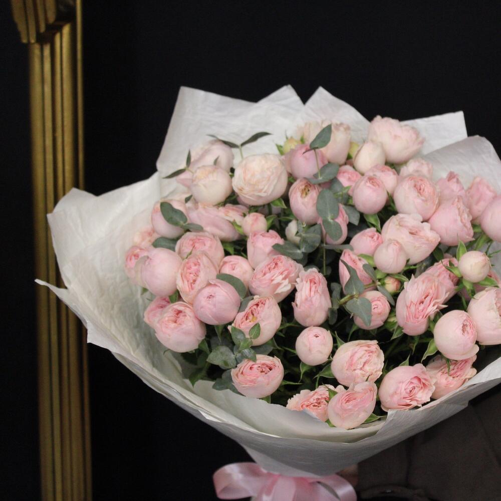 Роза кустовая пионовидная – 15 шт.Эвкалипт – 3 шт.жгкрафт упаковками – 13 шт.Лента атласная – 2 шт.