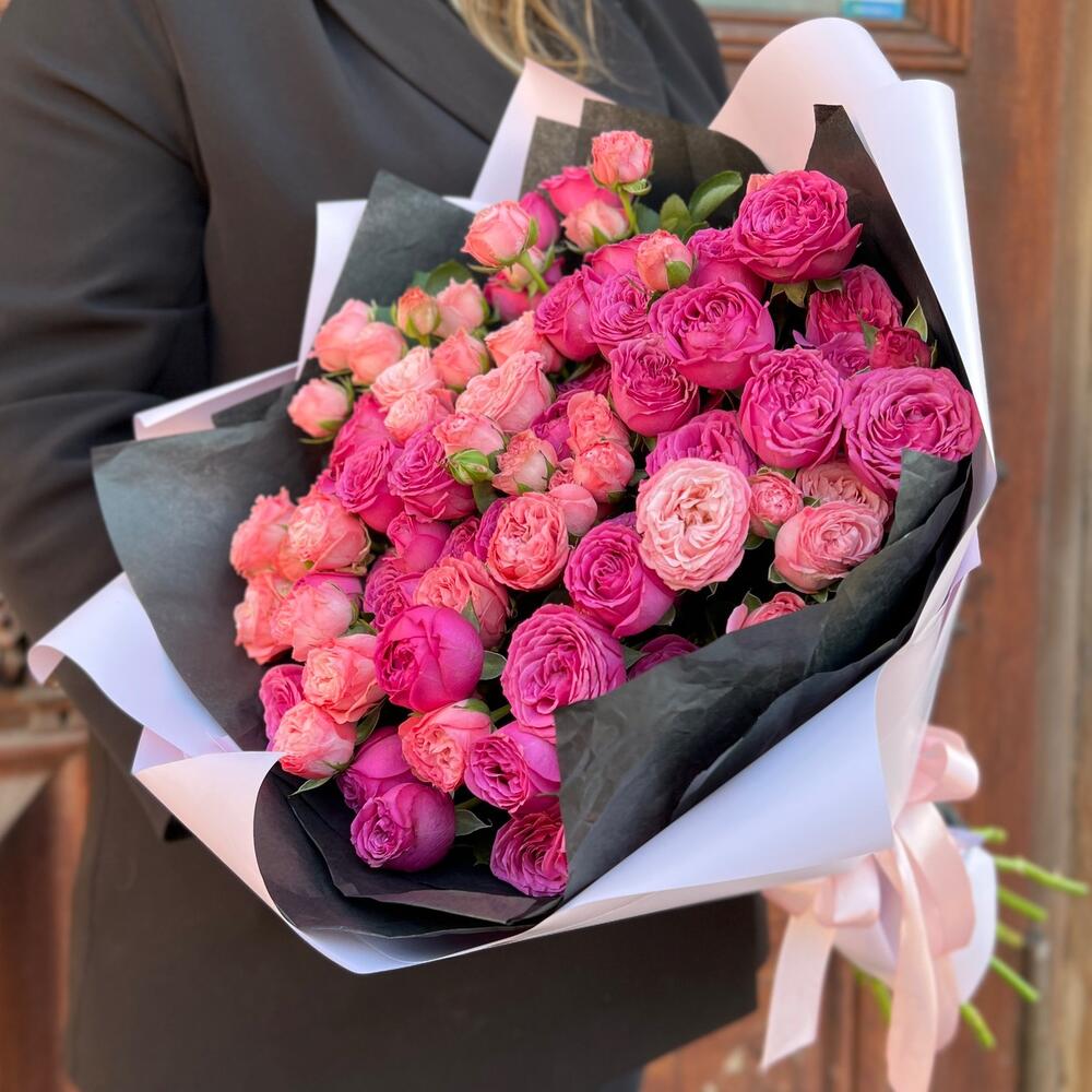 Лента атласная – 2 шт.Тишью – 2 шт.Пионовидная кустовая роза – 21 шт.Пленка матовая – 2 шт.