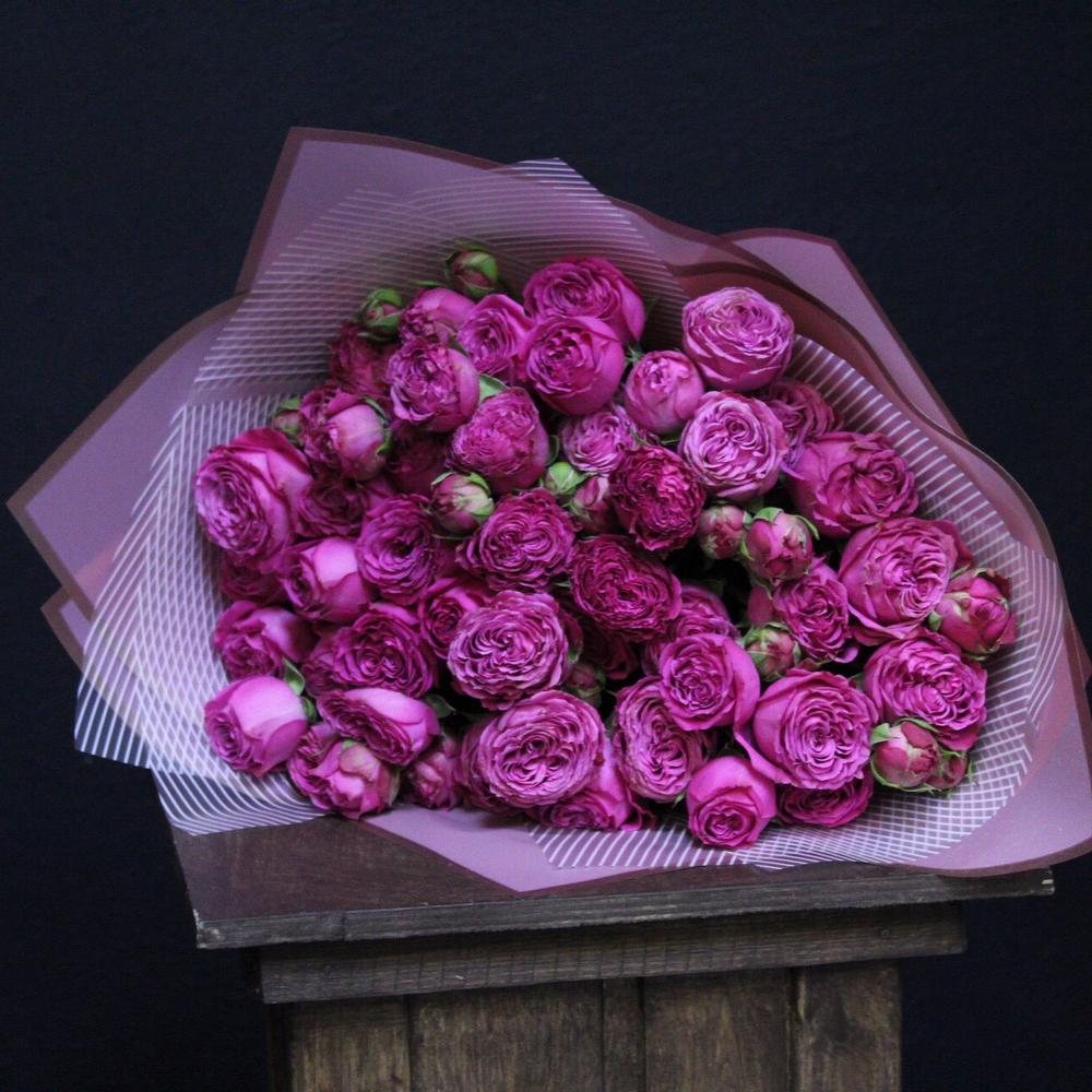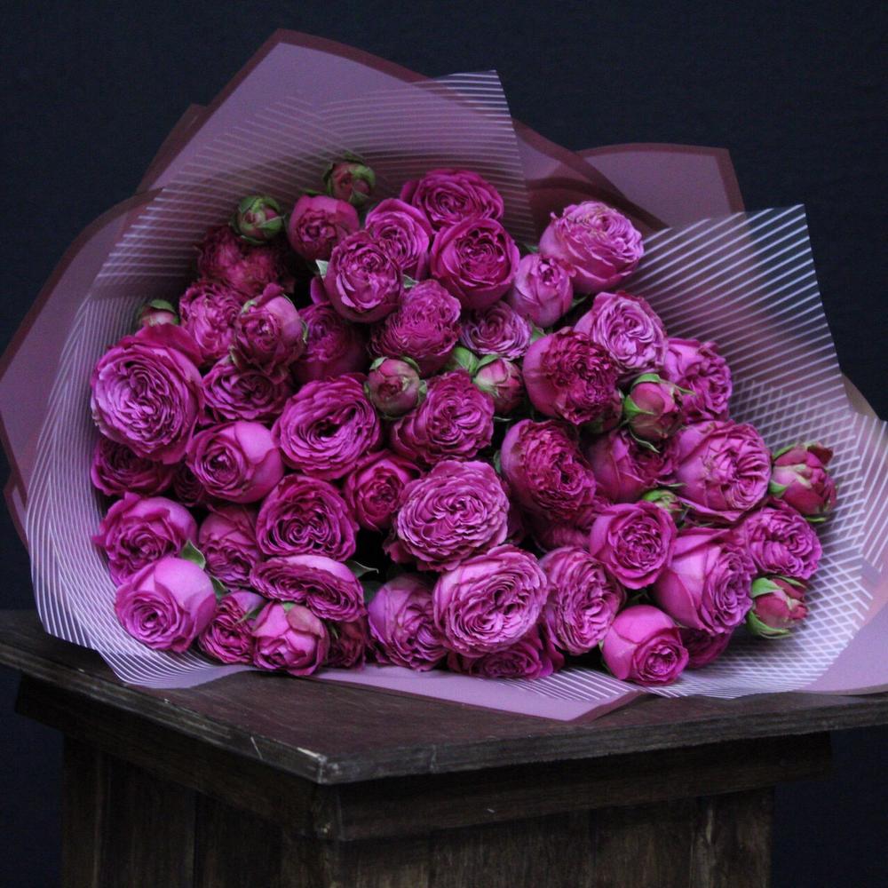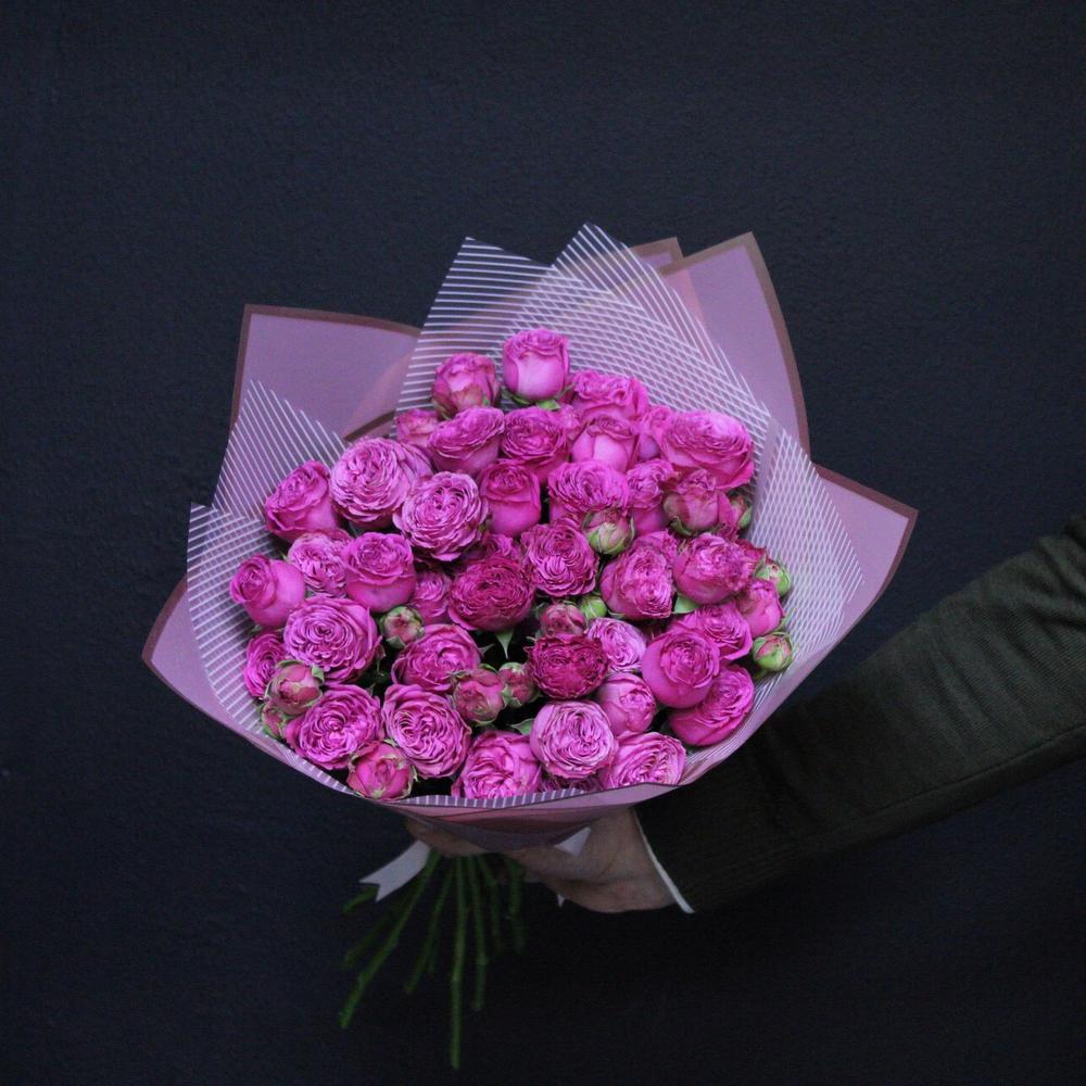 Пионовидная кустовая роза – 11 шт.Пленка матовая – 4 шт.Лента атласная – 2 шт.