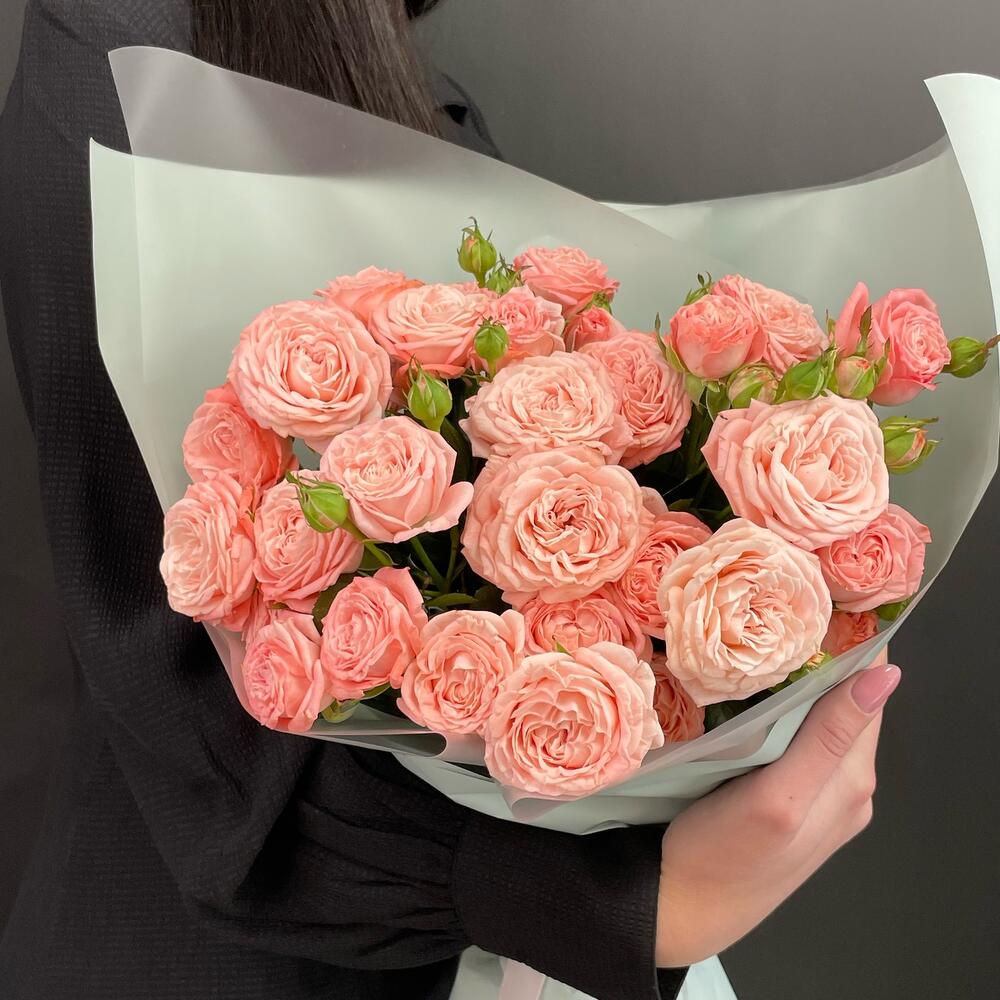 Лента атласная – 1 шт.Пленка матовая – 6 шт.кустовая пионовидная роза мадам бомбастик – 7 шт.
