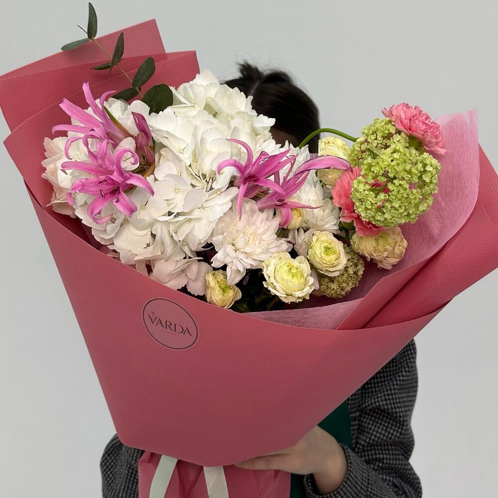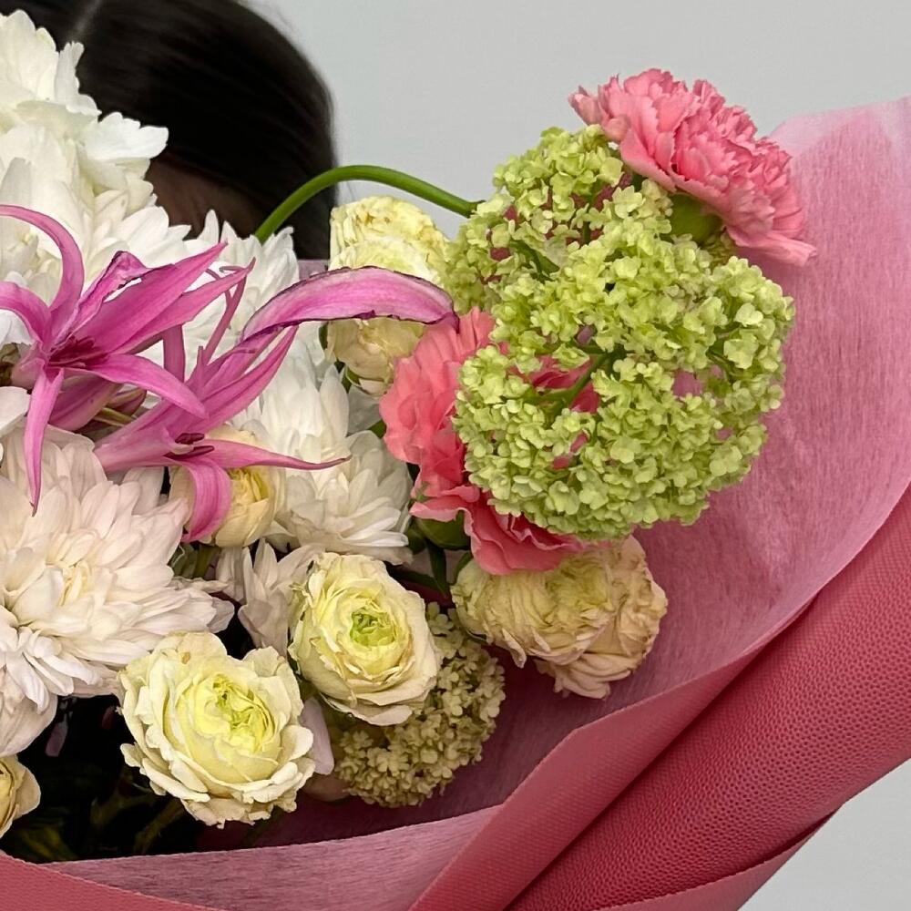 Альстромерии, Гортензии, Кустовые розы, Лизиантусы, Розы, Хризантемы