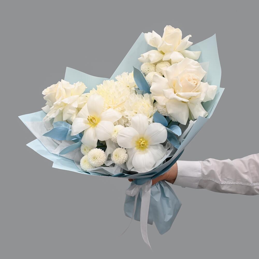 Рускус – 3 шт.Тюльпан – 2 шт.Хризантема кустовая – 3 шт.Хризантема – 1 шт.Гвоздика – 2 шт.Упаковка дизайнерская – 1 шт.Французская роза – 3 шт.