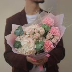 Рускус – 5 шт.Эвкалипт – 4 шт.Лента атласная – 1 шт.Кустовая роза Бомбастик – 2 шт.Гортензия розовая – 1 шт.Диантус розовый – 3 шт.Дизайнерская упаковка – 5 шт.стифа натуральная – 1 шт.