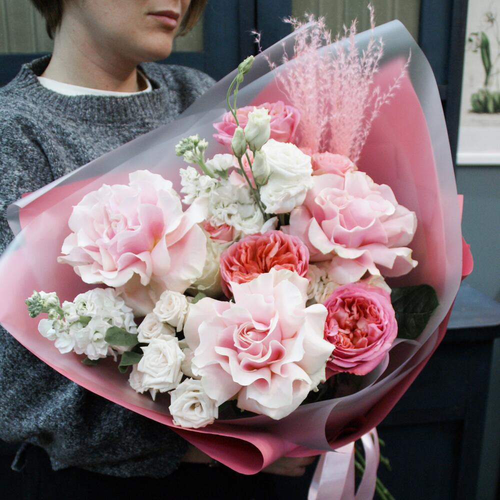 Маттиола – 2 шт.Кустовая роза – 4 шт.Эустома – 1 шт.Пионовидная роза – 3 шт.Атласная лента – 2 шт.Французская роза – 3 шт.Матовая пленка – 4 шт.мискантус – 2 шт.