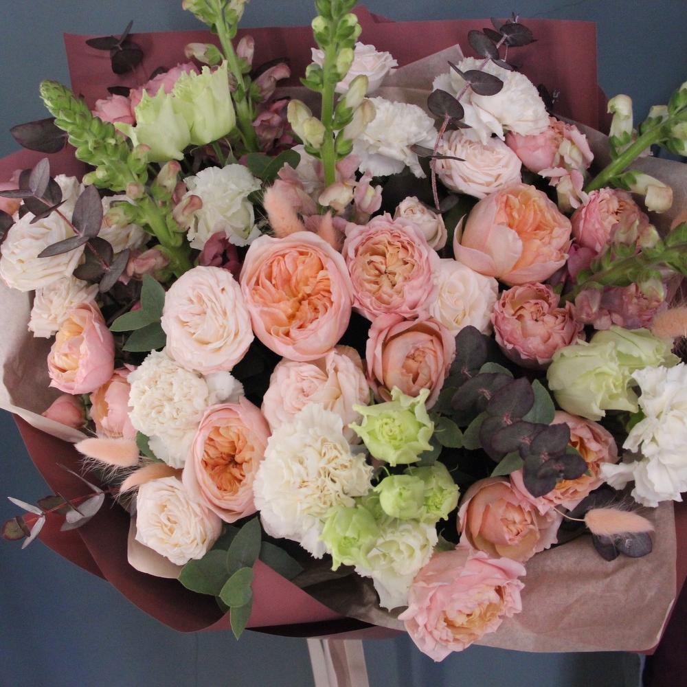 Роза пионовидная кустовая – 5 шт.Роза пионовидная – 3 шт.Львиный зев – 5 шт.Эвкалипт – 5 шт.Диантус – 7 шт.Фисташка – 3 шт.Лизиантус – 4 шт.Тишью – 3 шт.Бумага – 3 шт.Лента атласная – 2 шт.Лагурус – 15 шт.