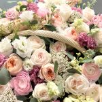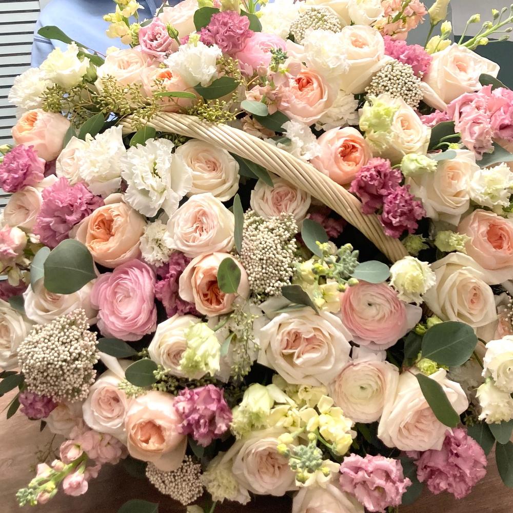 Огромная корзина с пионовидными розами и ранункулюсами